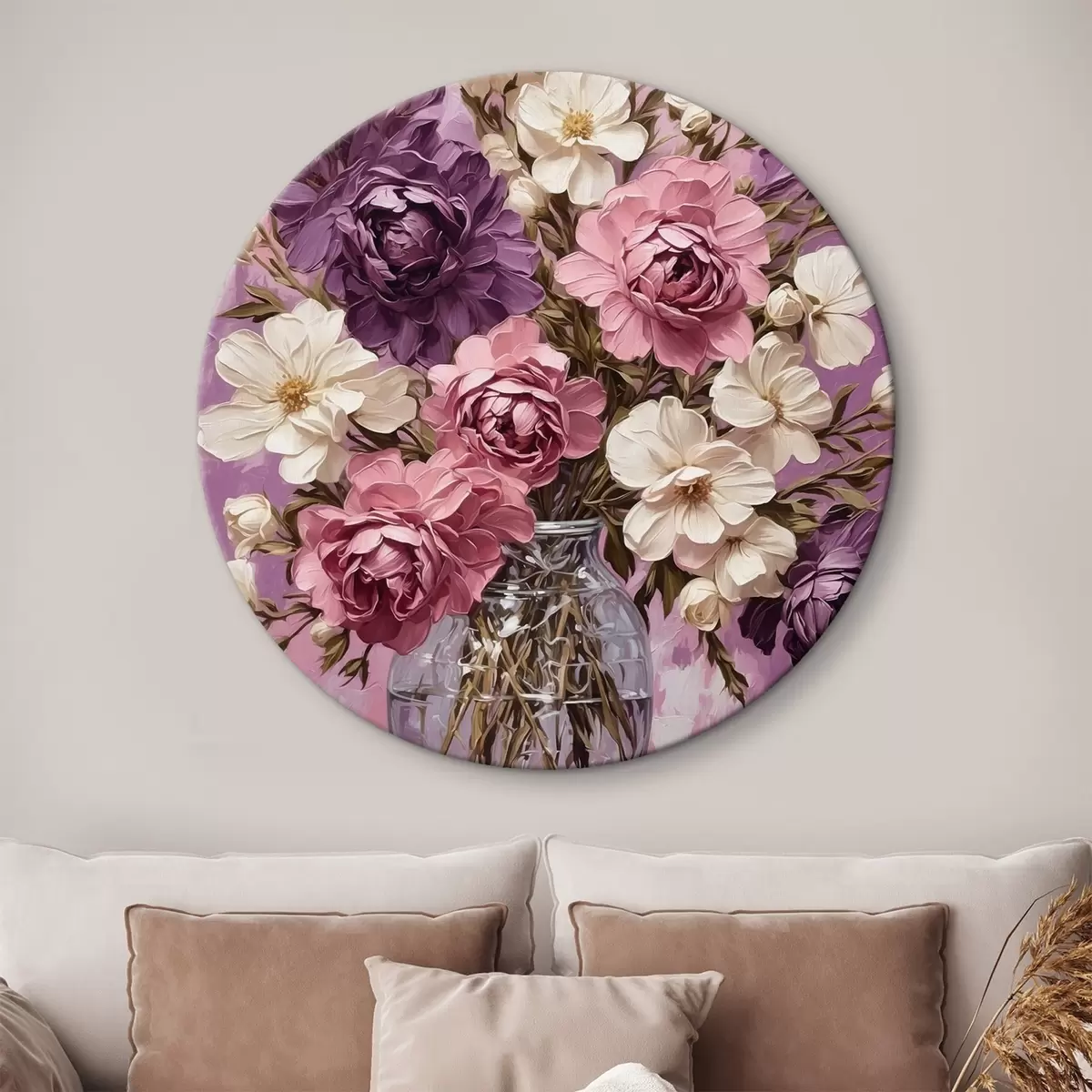 Picturi rotunde Flori în vază transparentă pe fundal violet Nr r42535