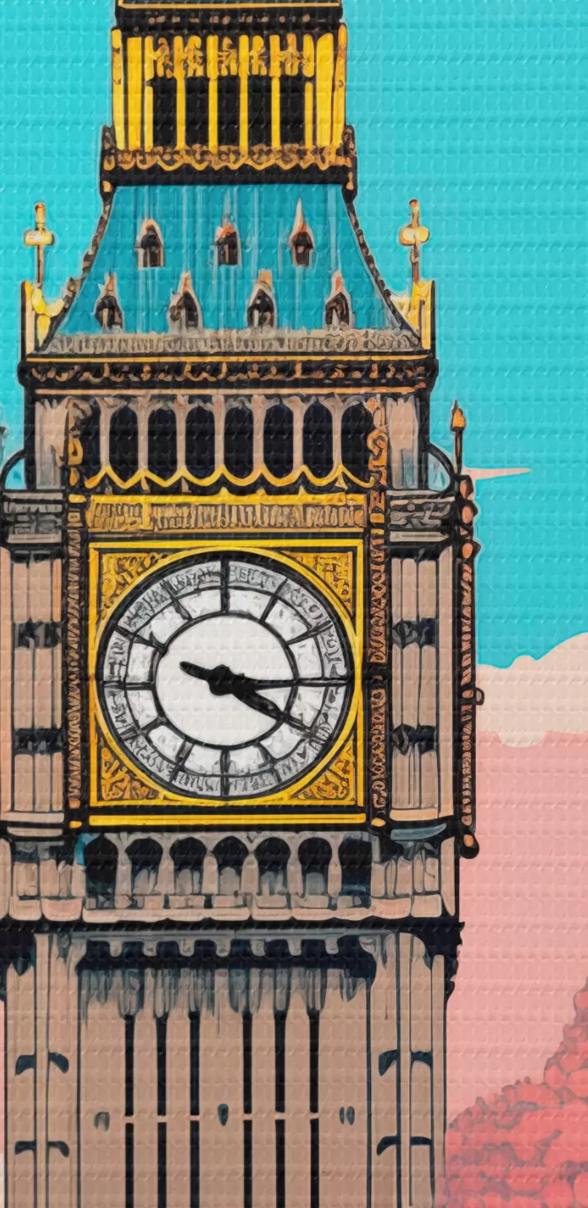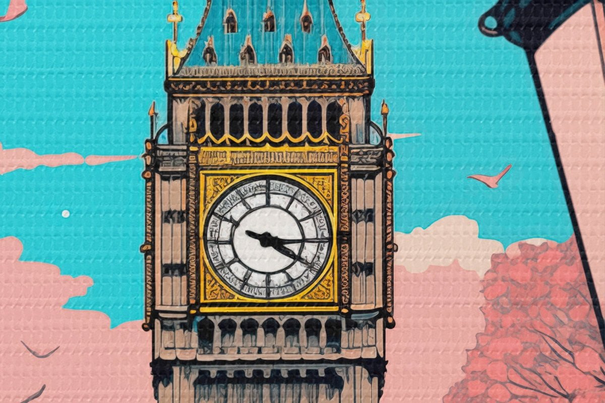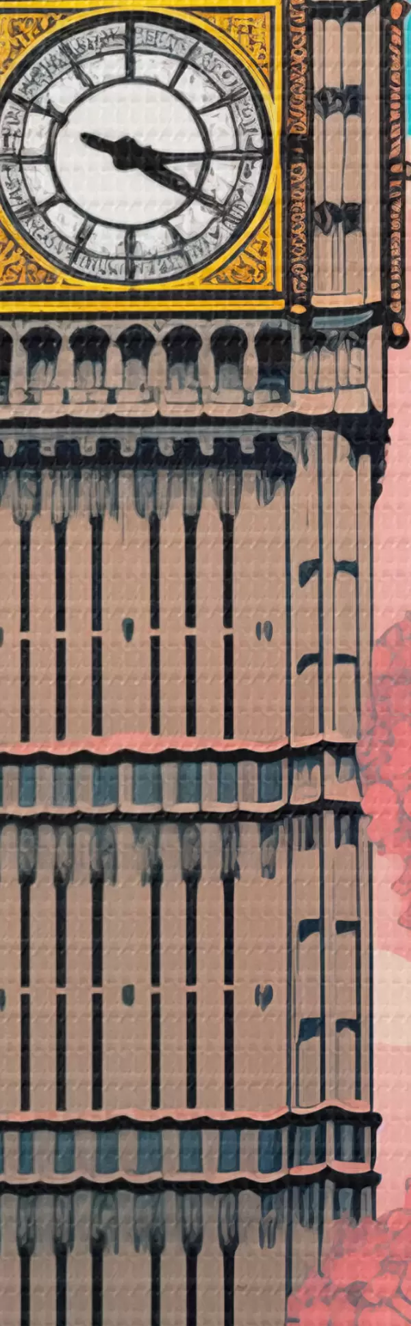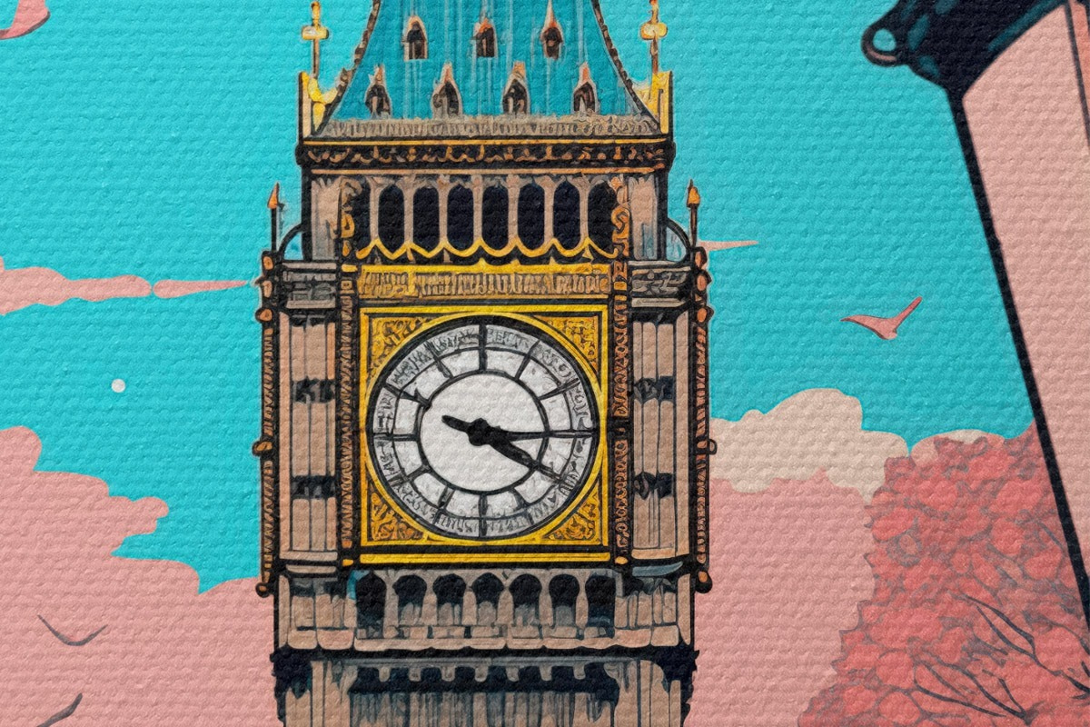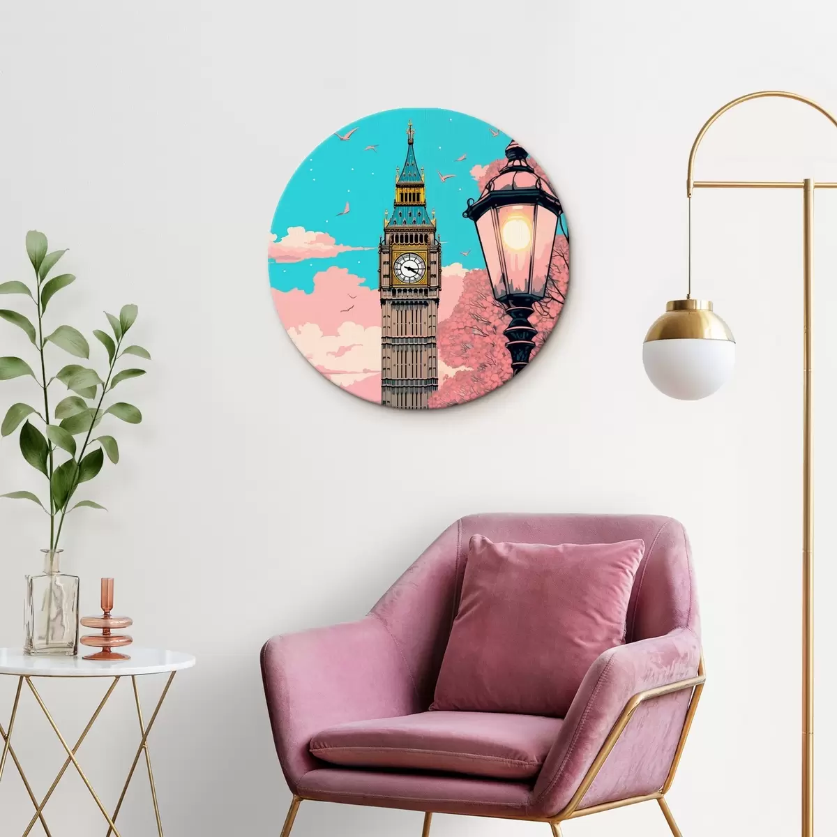 Picturi rotunde O vedere a Big Ben cu copaci roz de primăvară, un cer albastru strălucitor și un felinar de epocă în prim-plan Nr r42578