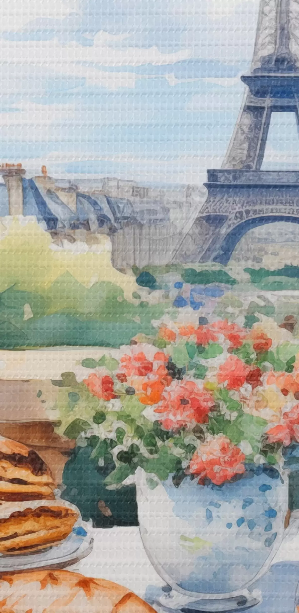 Picturi rotunde O priveliște romantică a Turnului Eiffel de la un balcon cu o masă aranjată cu deserturi, ceai și flori într-o atmosferă de vară Nr r42579