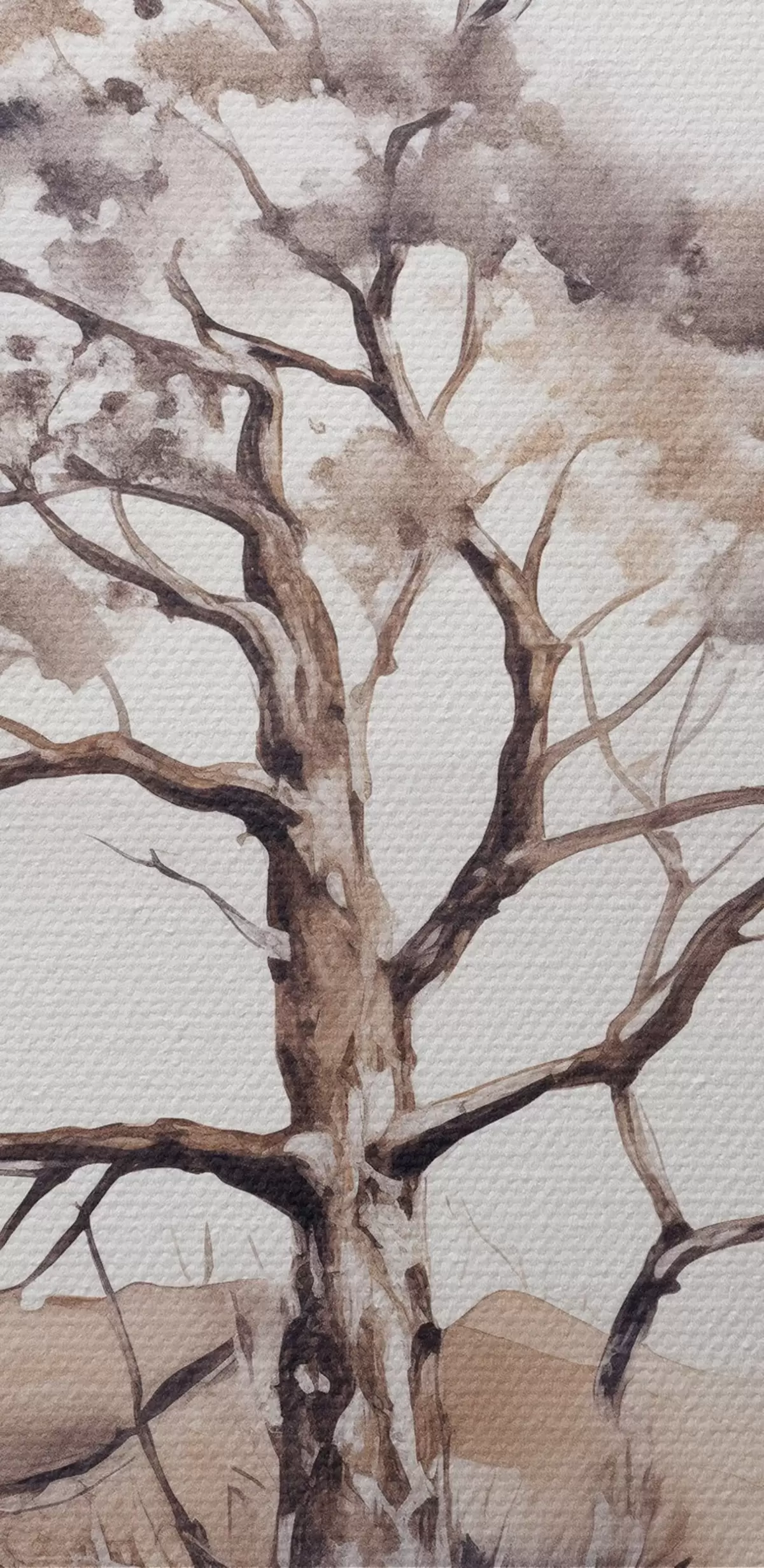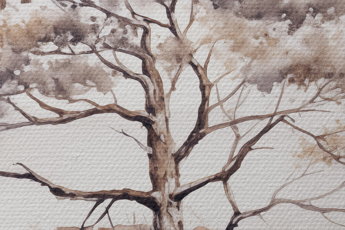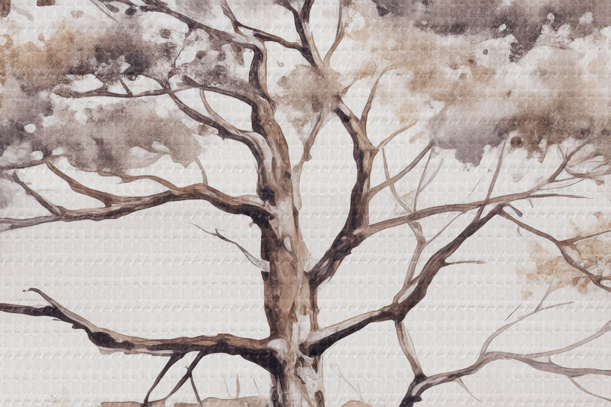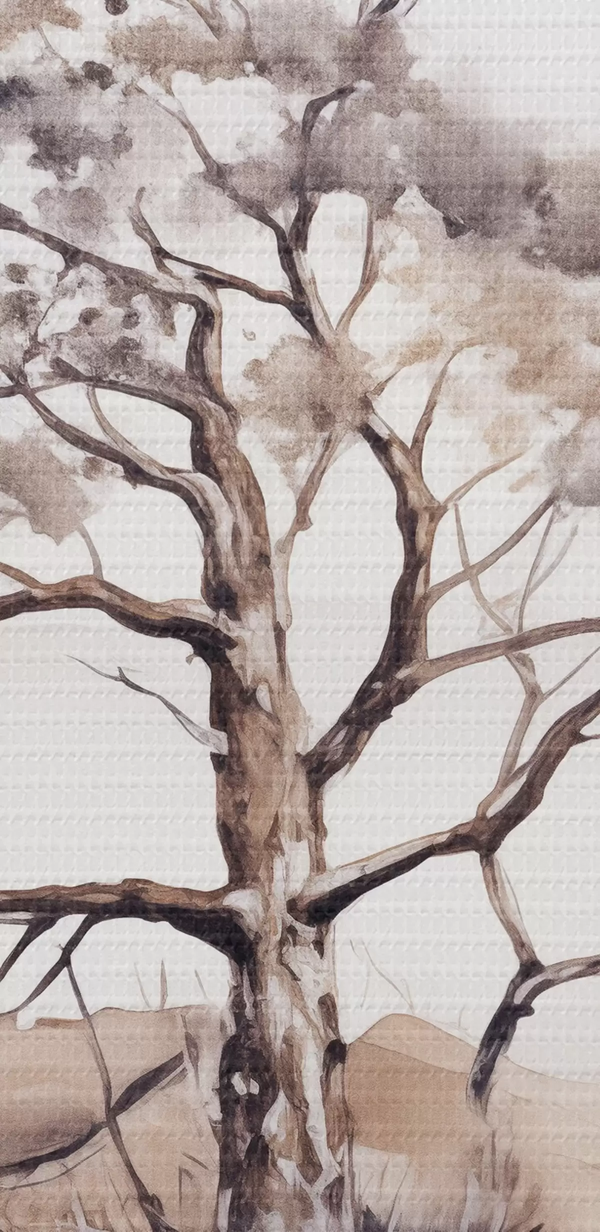 Picturi rotunde Un copac solitar, cu trunchiul răsucit și ramuri rare, pe un fundal de munți moale și estompat Nr r42715