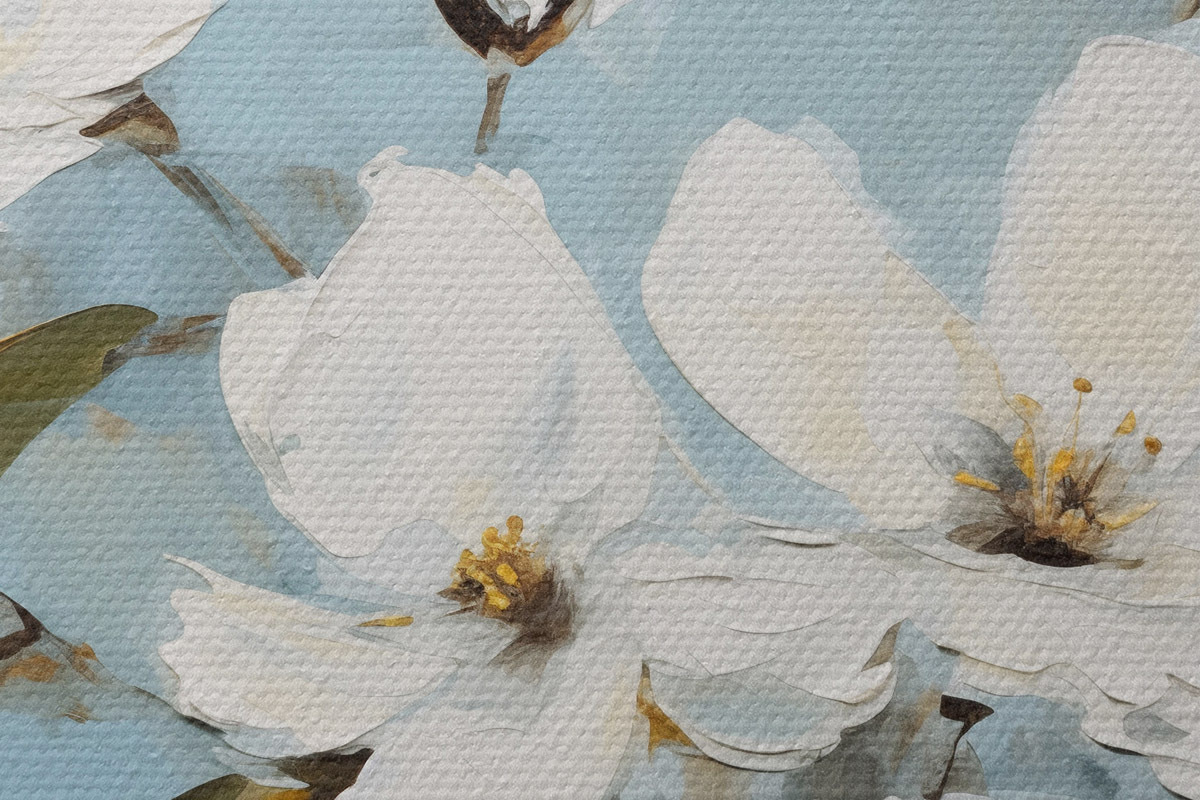 Picturi rotunde Flori albe cu petale delicate și frunze verzi pe un fundal albastru deschis imitație pictură în ulei r42719