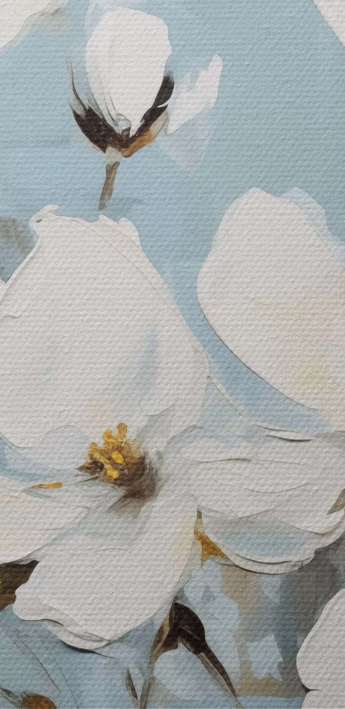 Picturi rotunde Flori albe cu petale delicate și frunze verzi pe un fundal albastru deschis imitație pictură în ulei Nr r42719