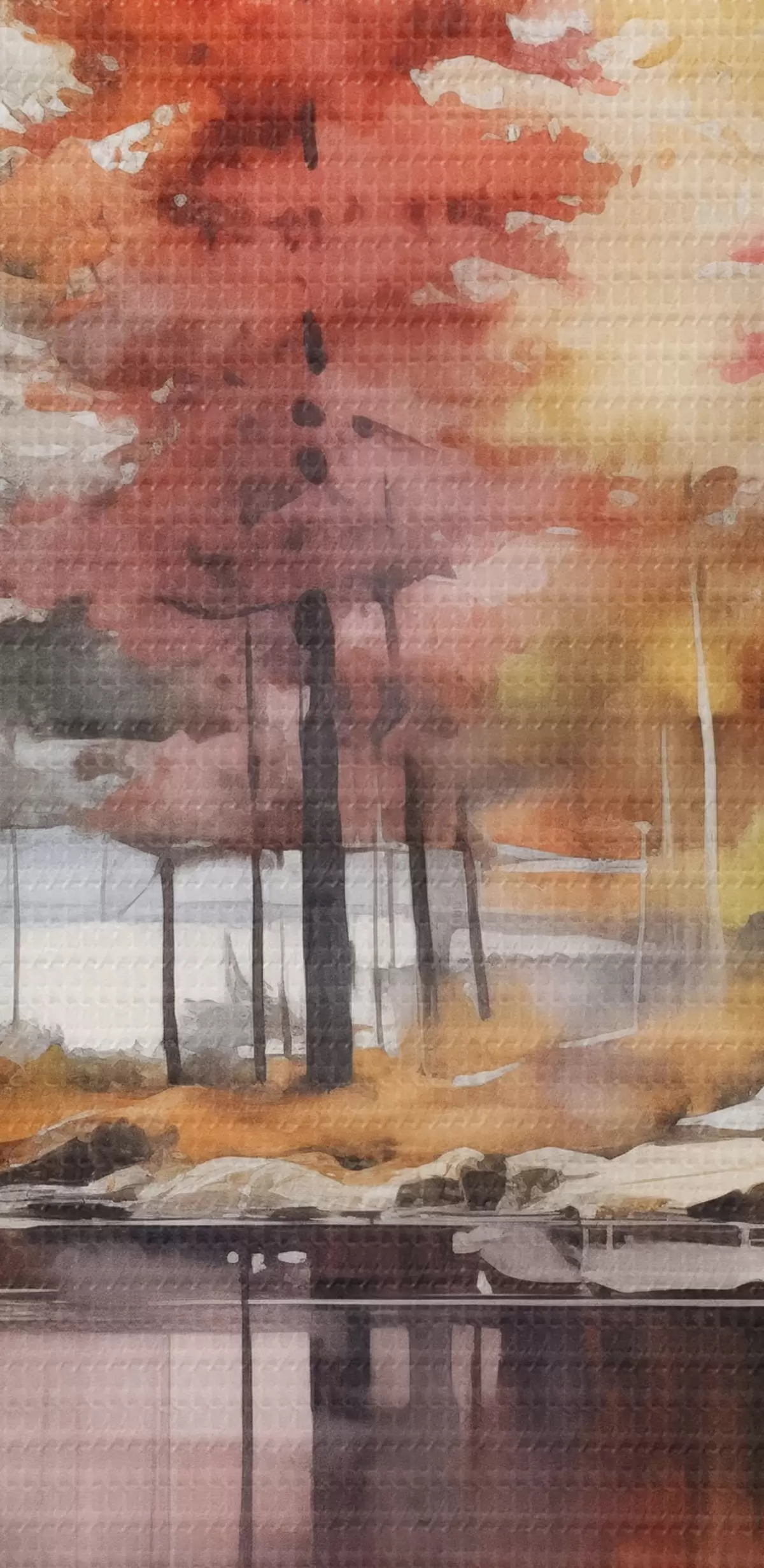 Picturi rotunde Peisaj tip acuarelă cu un lac înconjurat de copaci în culori vibrante de toamnă Nr r42727