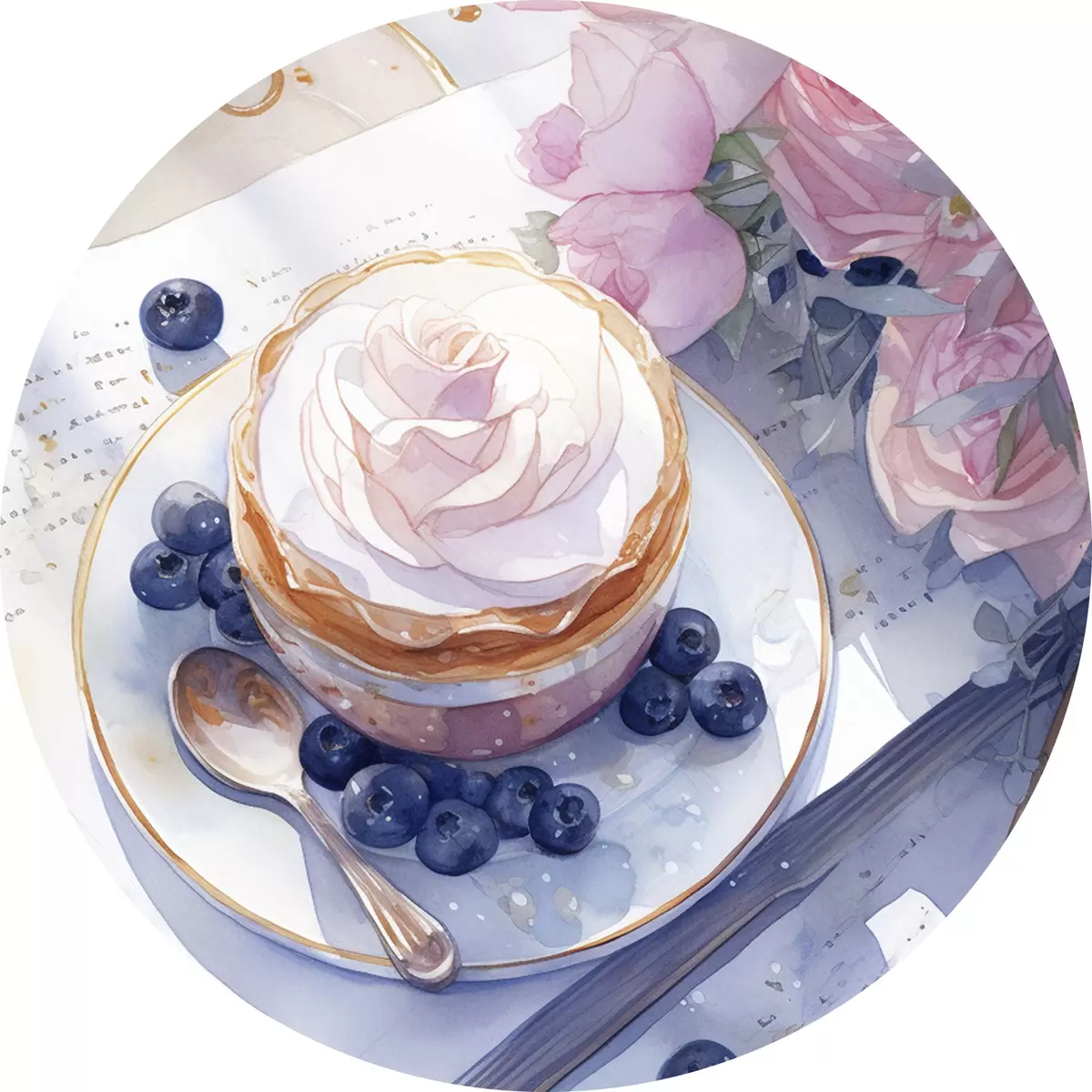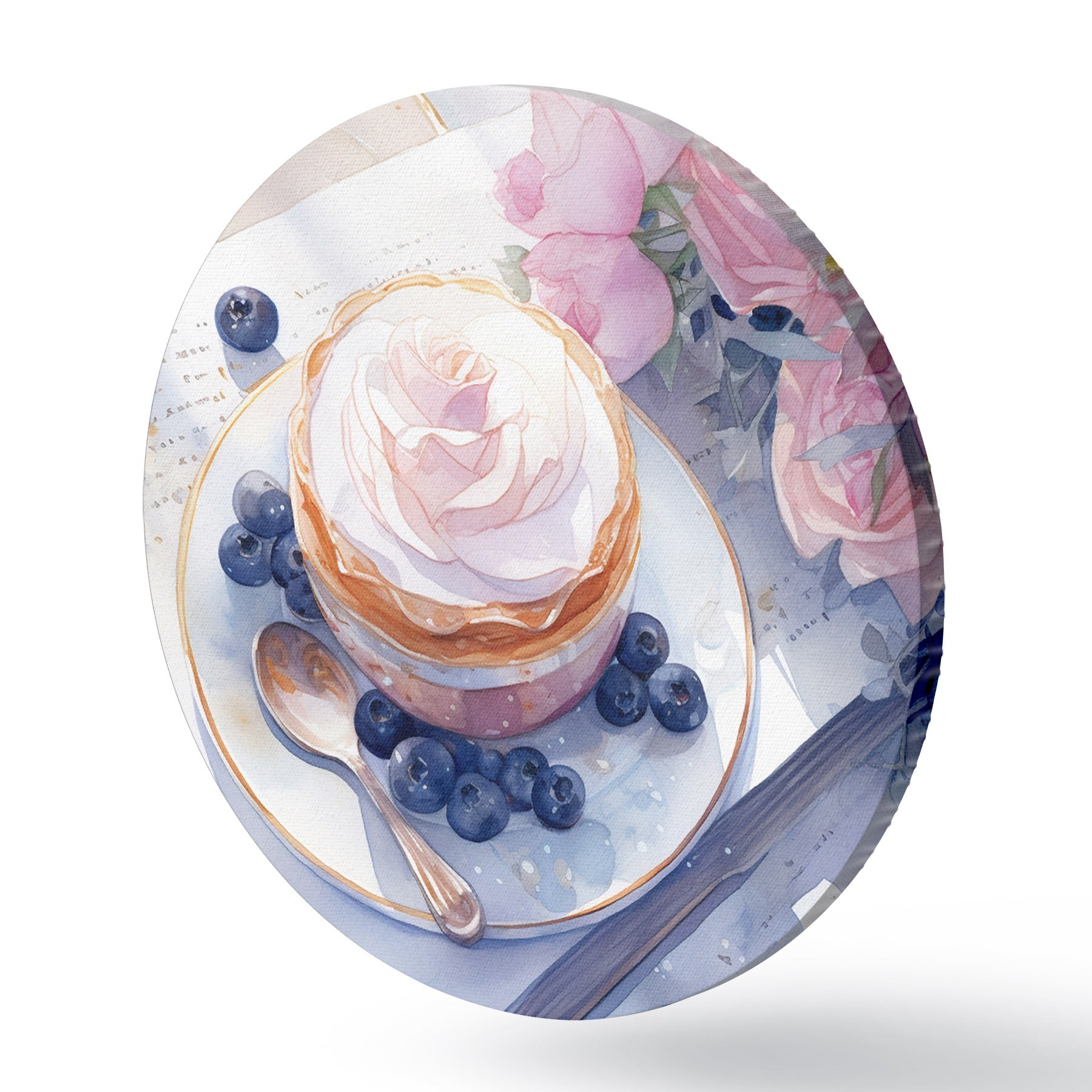 Picturi rotunde Blueberry cupcake, stil boho, acuarelă, trandafiri roz, poetic r43053