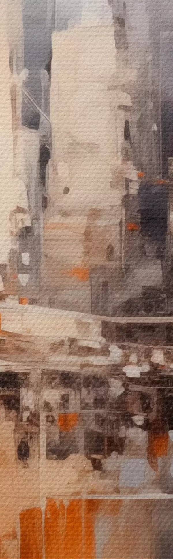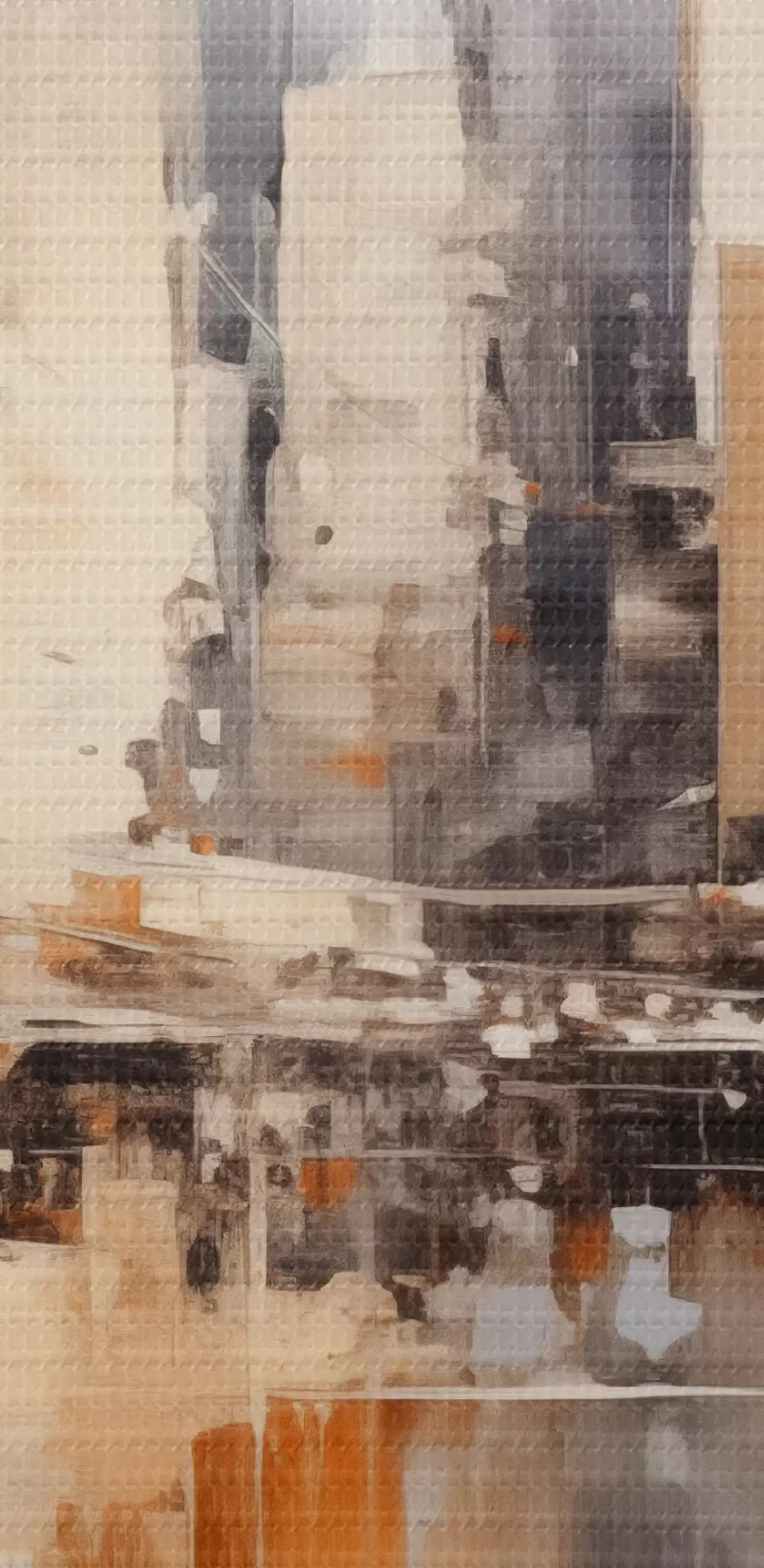 Picturi rotunde Pictura abstractă a peisajului urban cu clădiri înalte în nuanțe de maro, gri și alb, reflectate în apa de mai jos Nr r43168