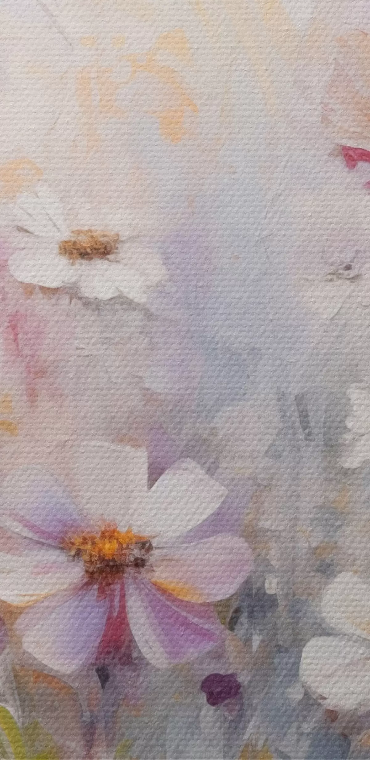 Picturi rotunde Abstract câmp texturat de flori albe și roz, culori pastelate moi, tușe delicate, pajiște florală r43170