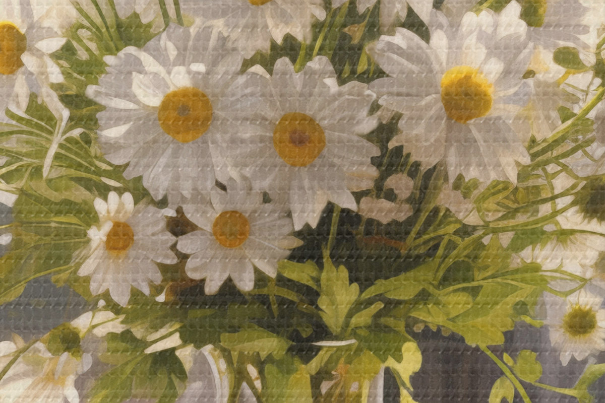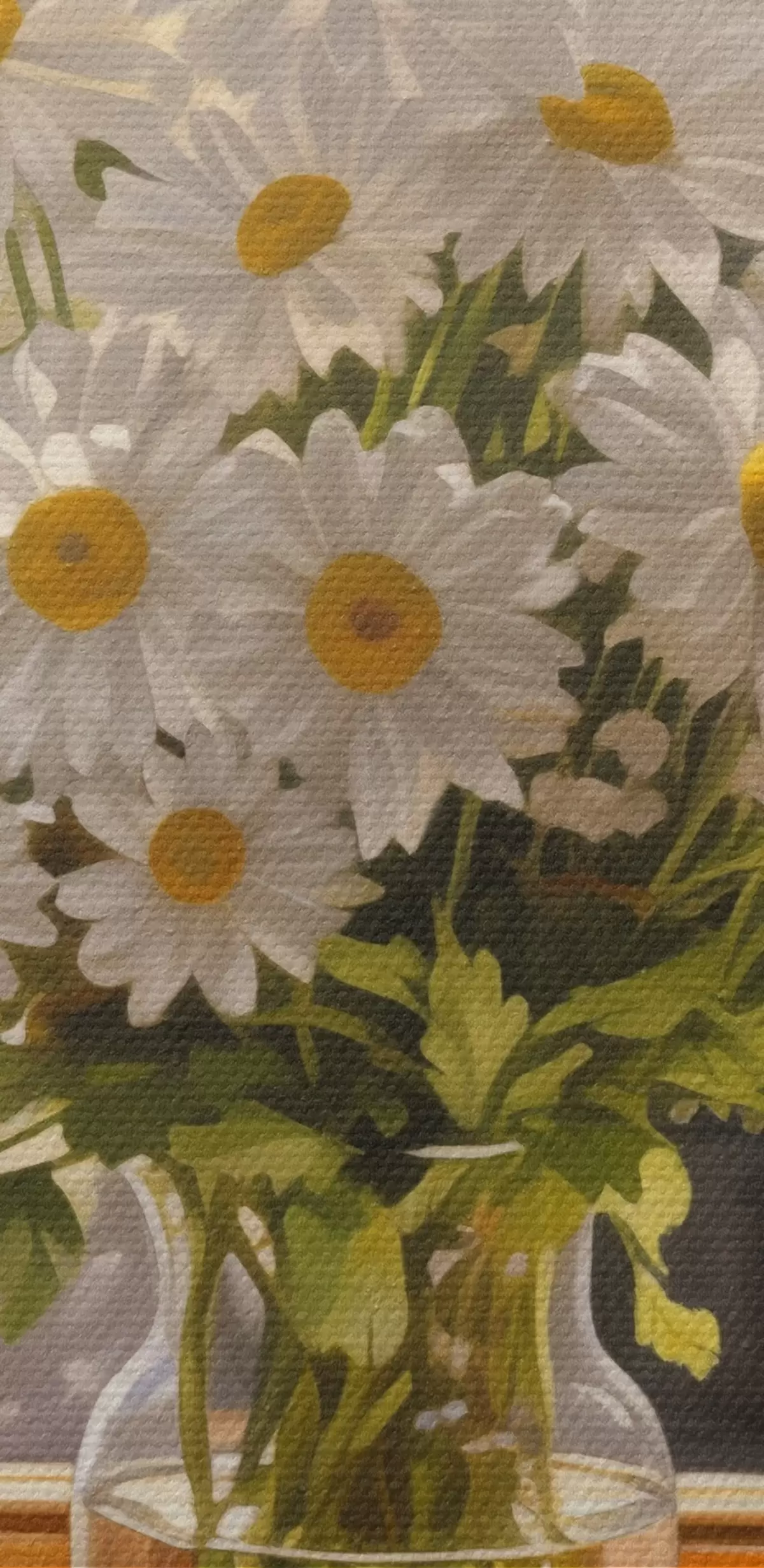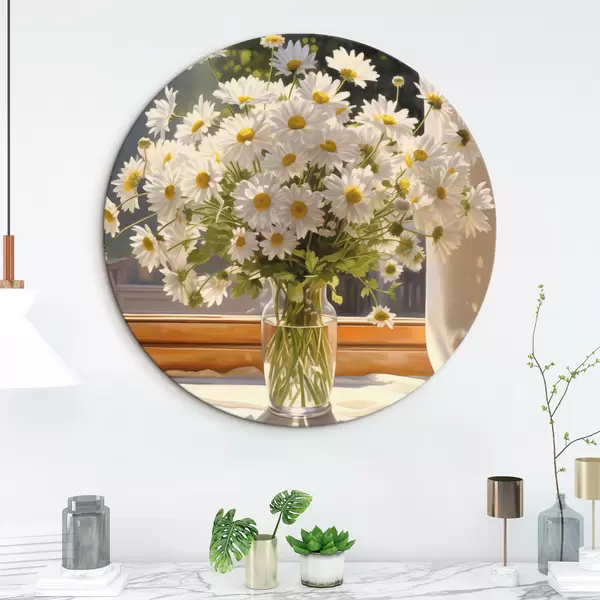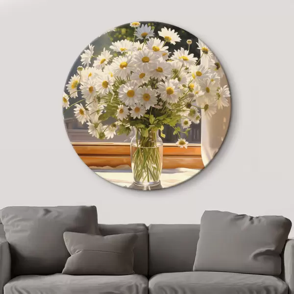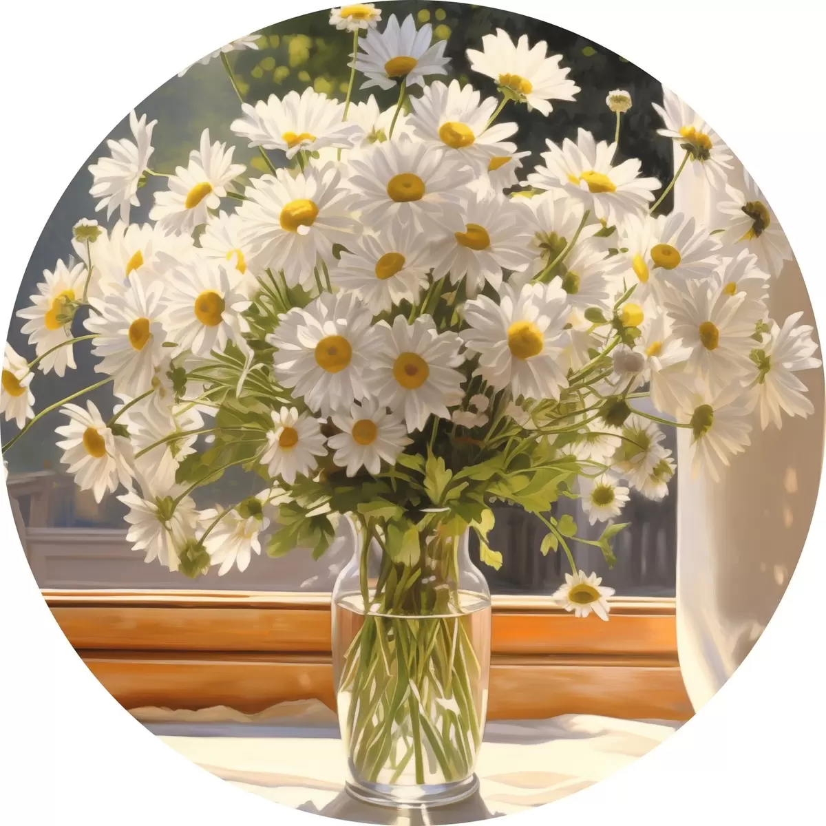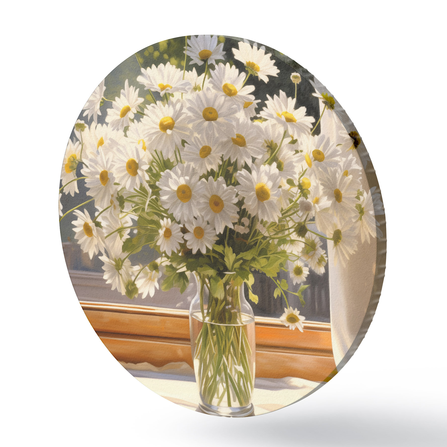 Picturi rotunde Ulei pictura imitație de o vază cu margarete albe pe un pervaz, zi însorită, paleta de culori calde Nr r43171