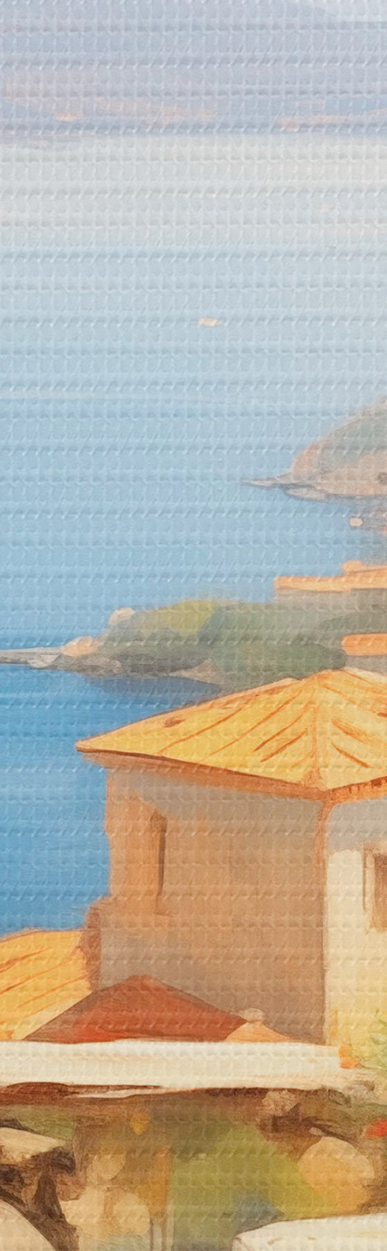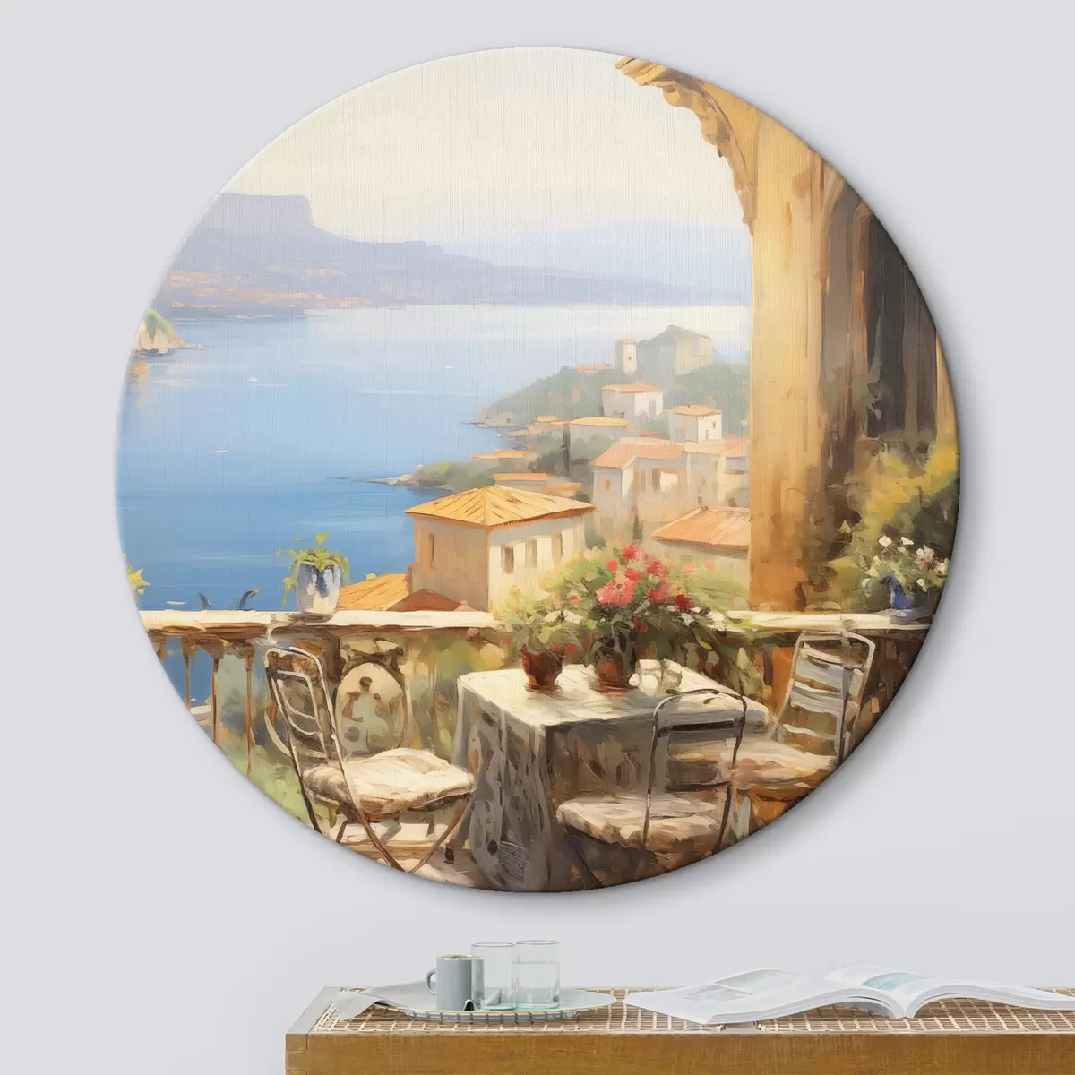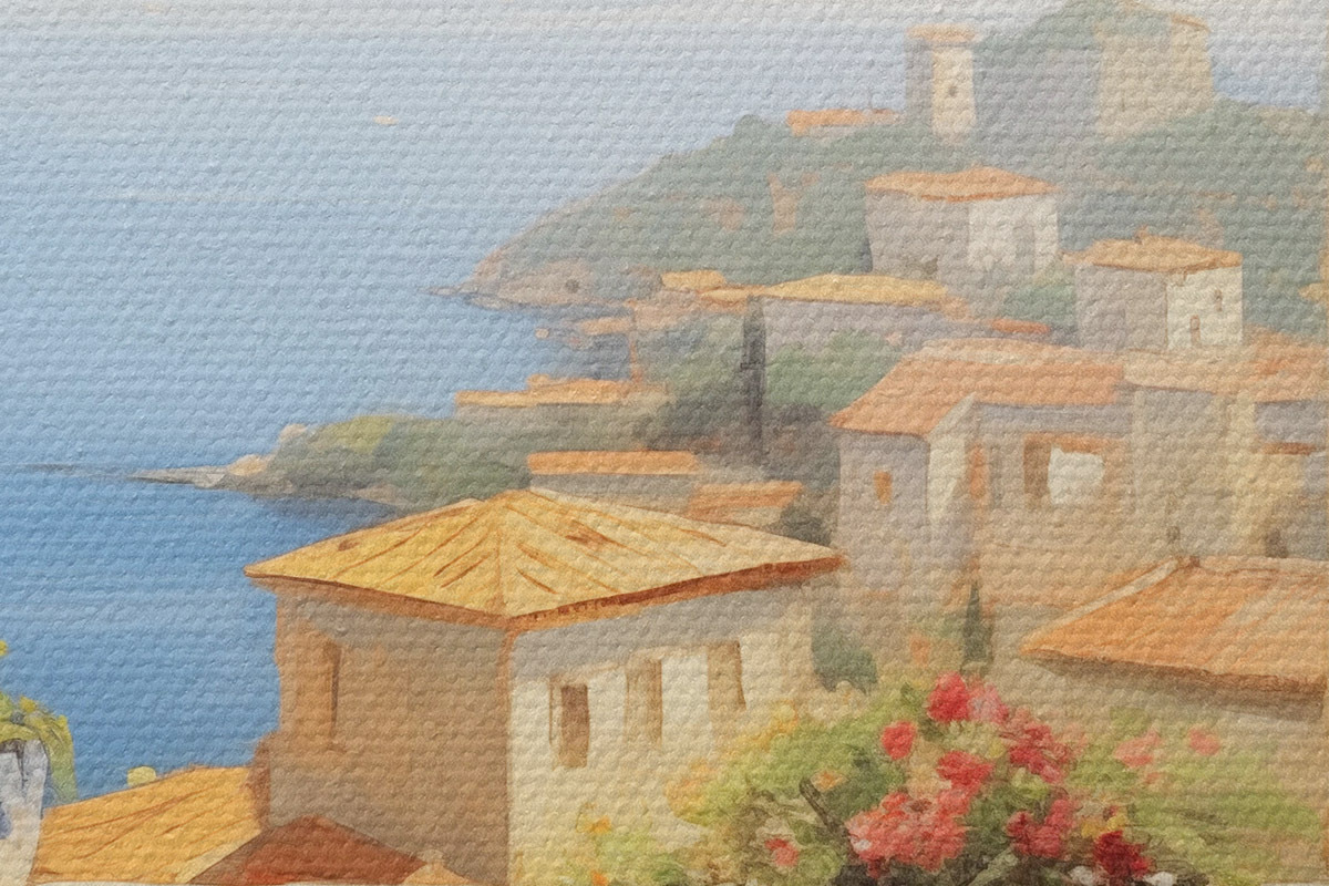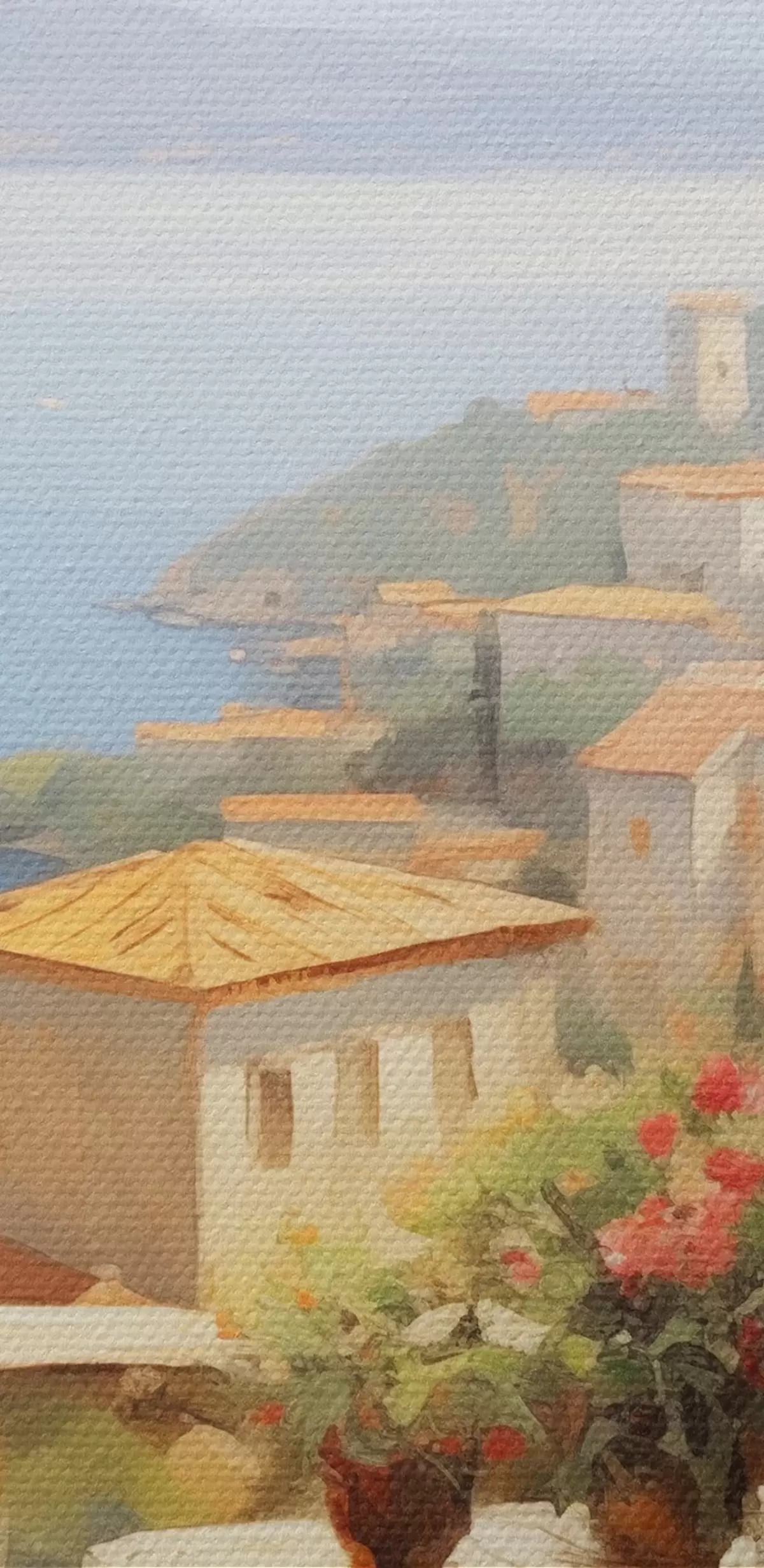 Picturi rotunde Pictura in ulei imitație de balcon cu flori, cu vedere la mare, case pe coasta, zi însorită, cer albastru Nr r43173