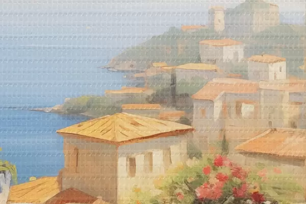 Picturi rotunde Pictura in ulei imitație de balcon cu flori, cu vedere la mare, case pe coasta, zi însorită, cer albastru Nr r43173