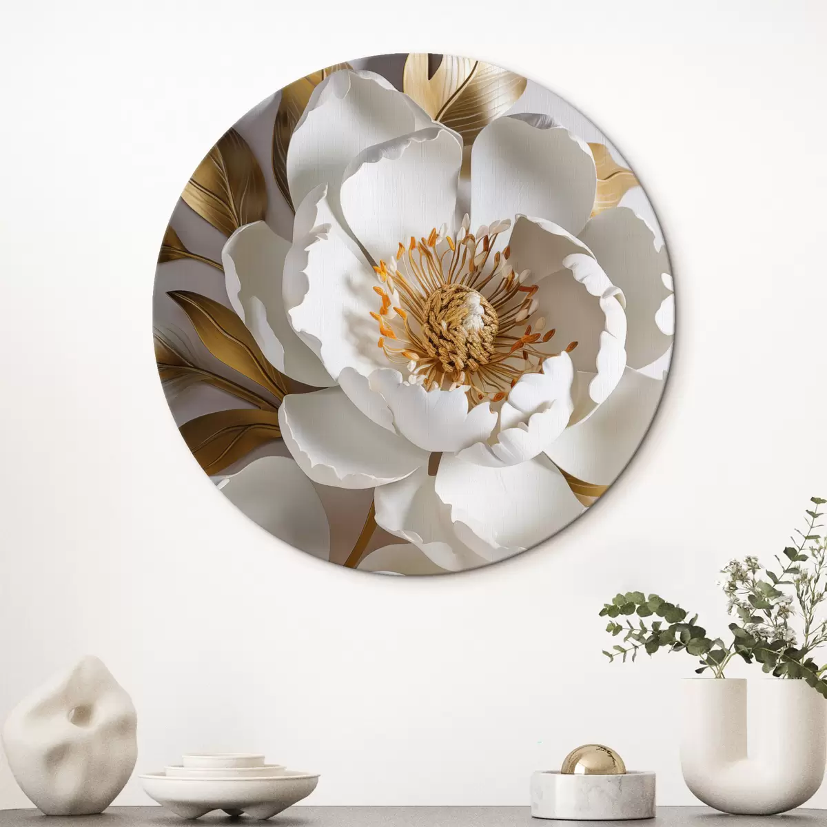 Picturi rotunde Alb delicat detaliate flori de bujor decorative cu frunze galbene, fundalul este o culoare gri deschis Nr r43176