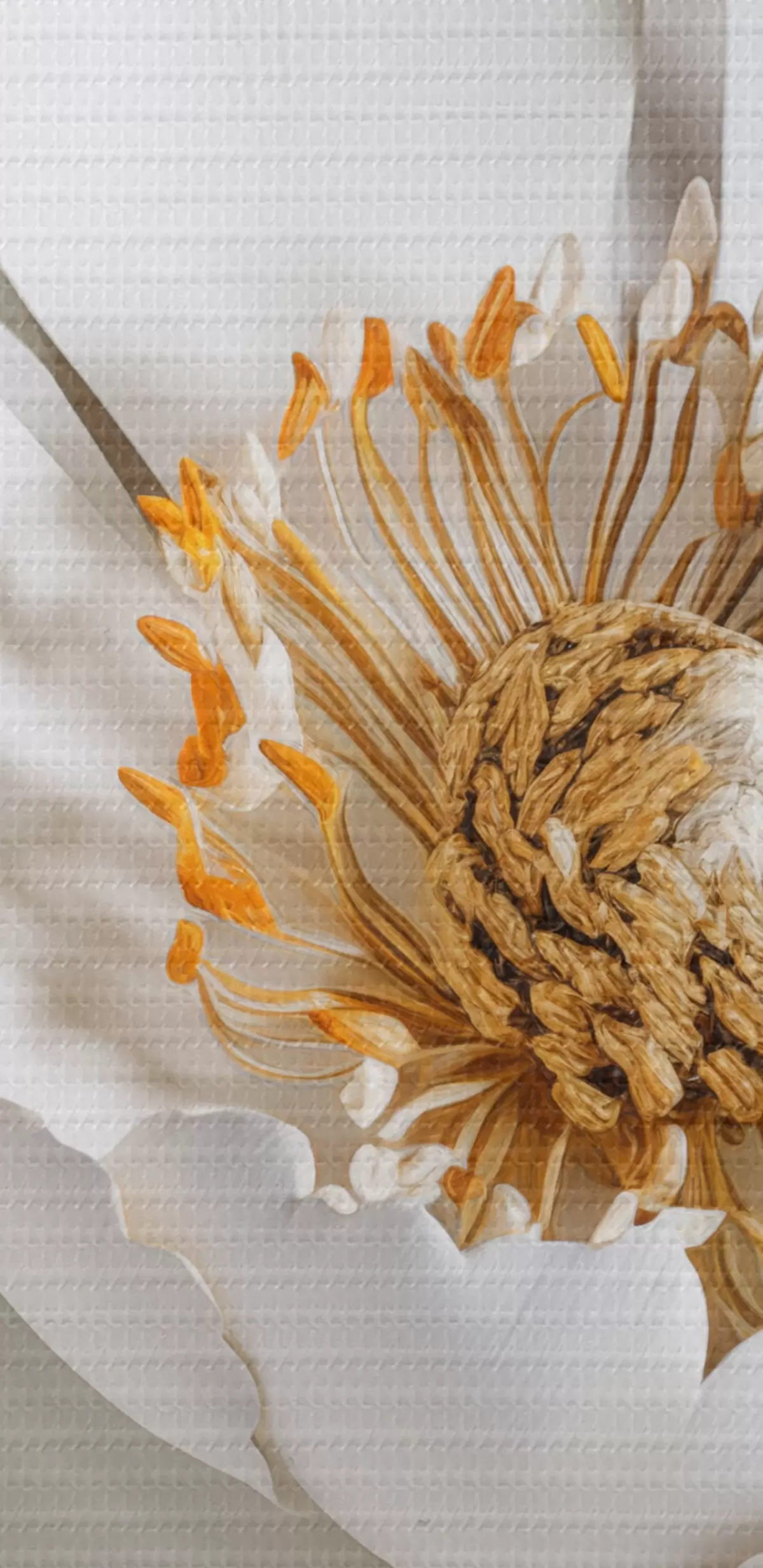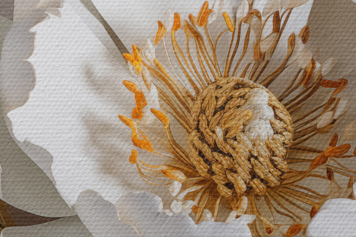 Picturi rotunde Alb delicat detaliate flori de bujor decorative cu frunze galbene, fundalul este o culoare gri deschis r43176