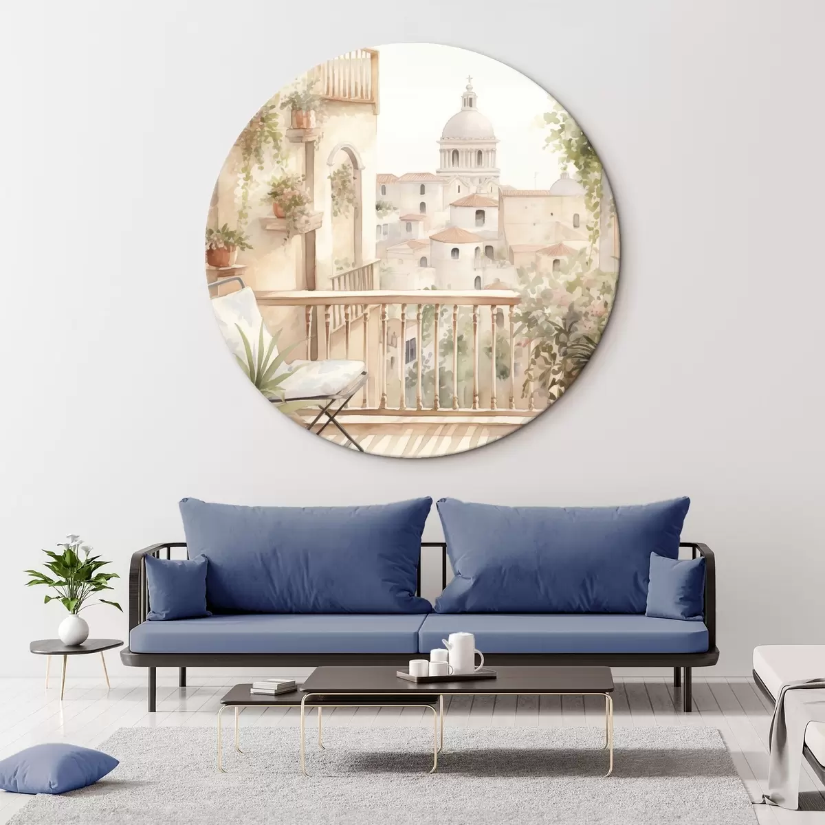 Picturi rotunde Balcon de vară estetic, Spania, arhitectură veche, blomming, stil acuarelă r43180
