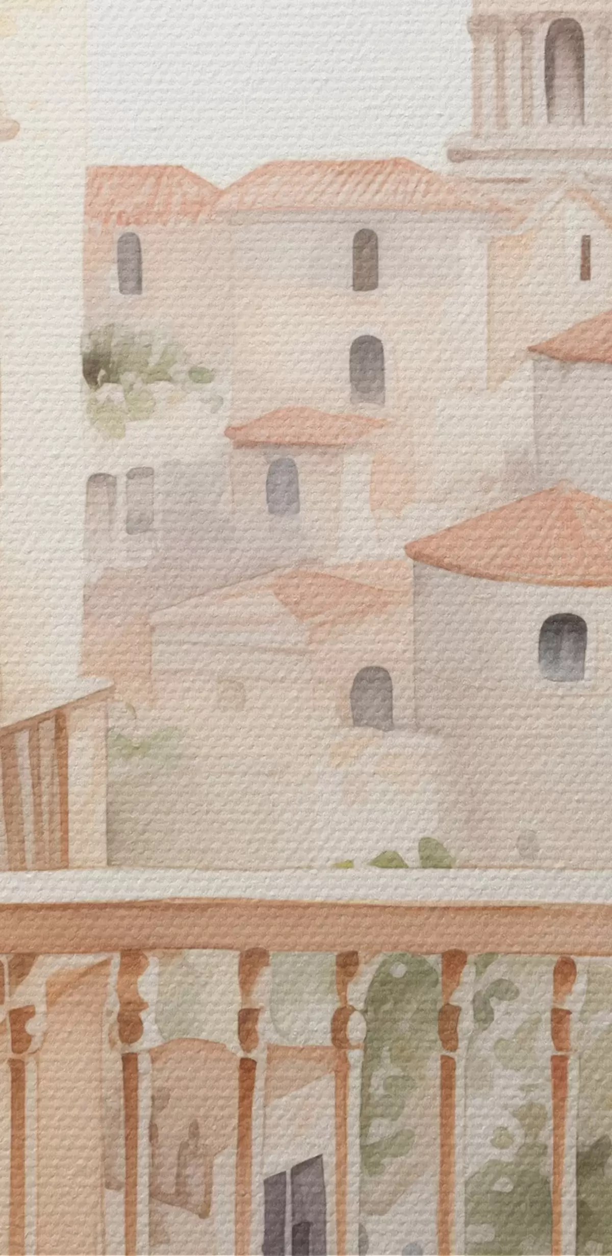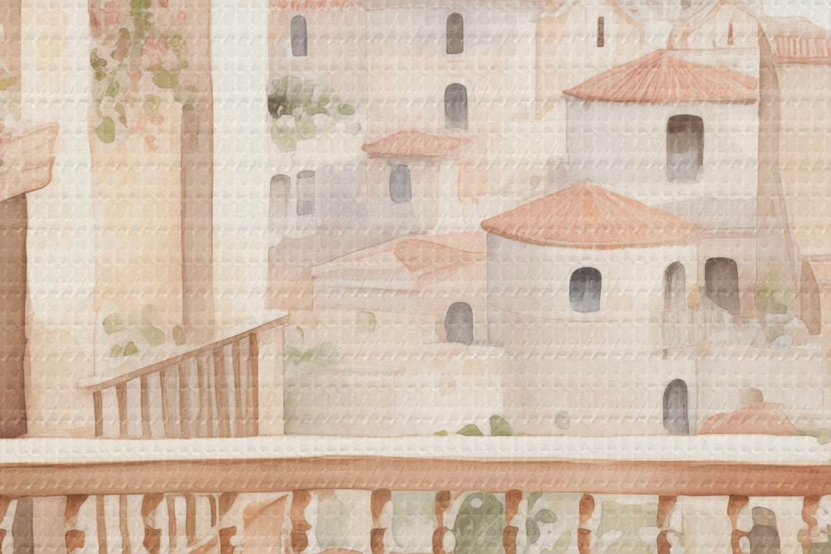 Picturi rotunde Balcon de vară estetic, Spania, arhitectură veche, blomming, stil acuarelă Nr r43180