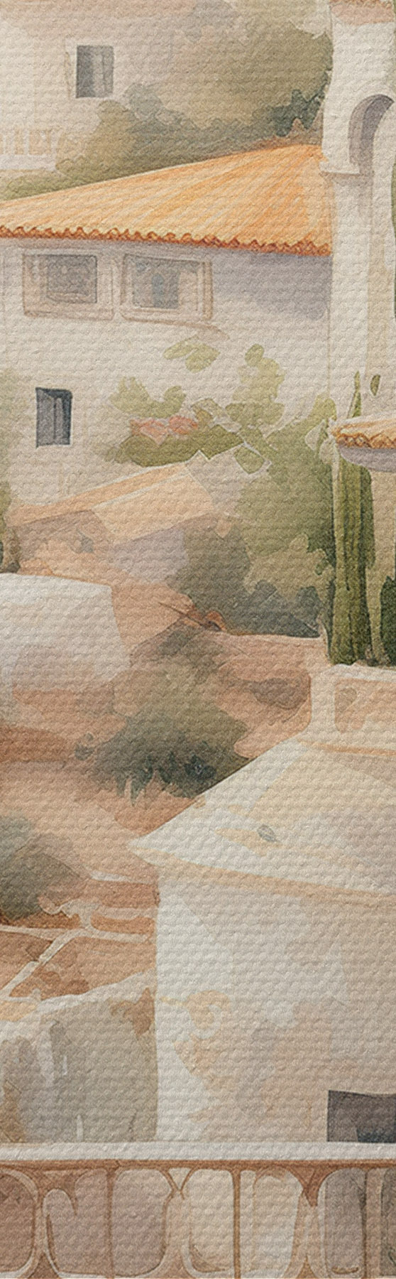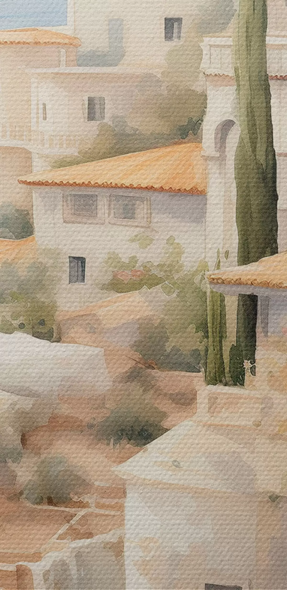 Picturi rotunde Spania peisaj de vară, arhitectura mediteraneană, stil acuarelă Nr r43181
