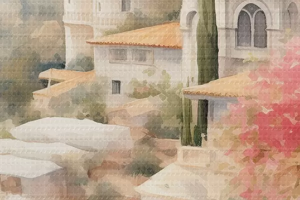 Picturi rotunde Spania peisaj de vară, arhitectura mediteraneană, stil acuarelă Nr r43181