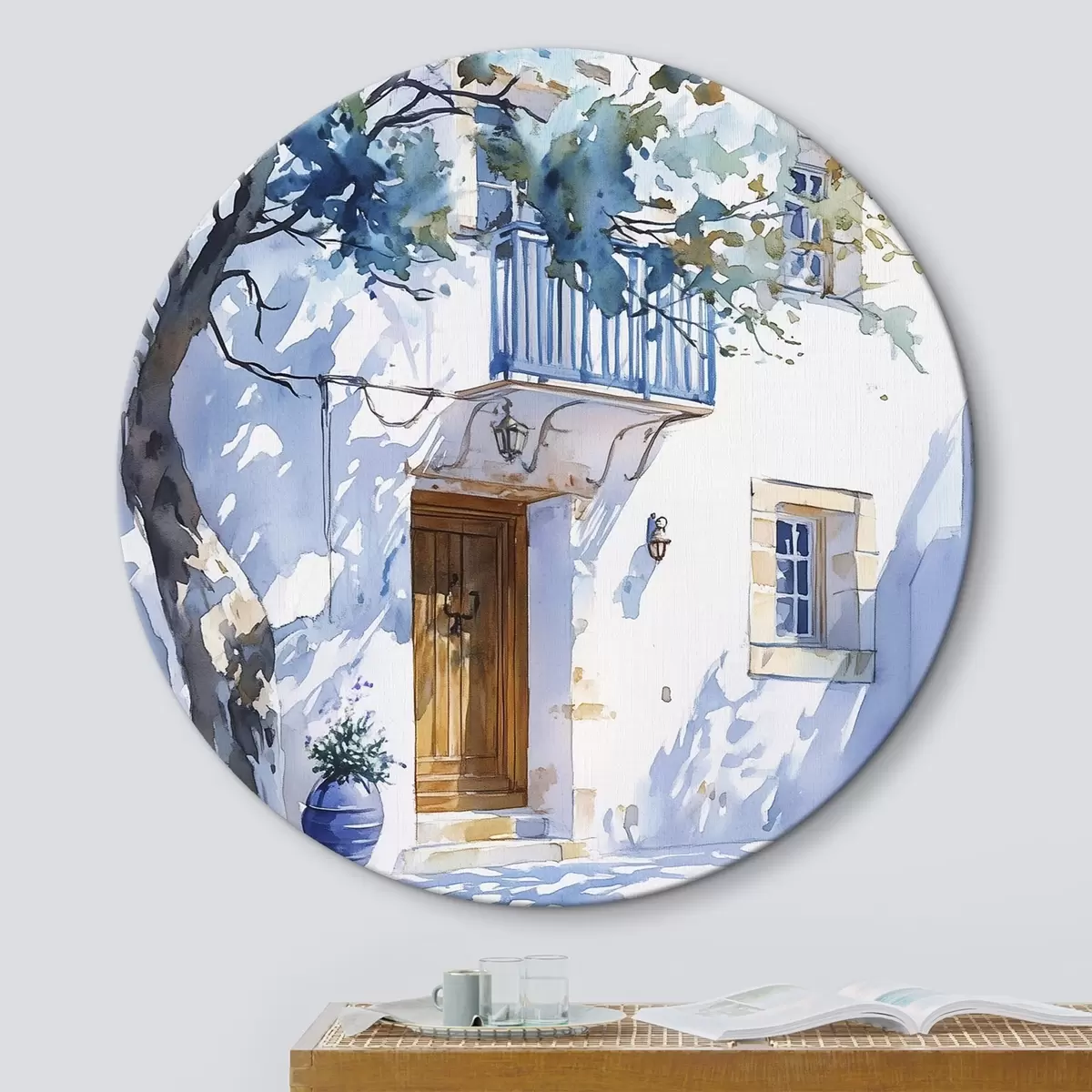 Picturi rotunde Stil acuarelă, casă grecească, copac înflorit, arhitectură Nr r43182