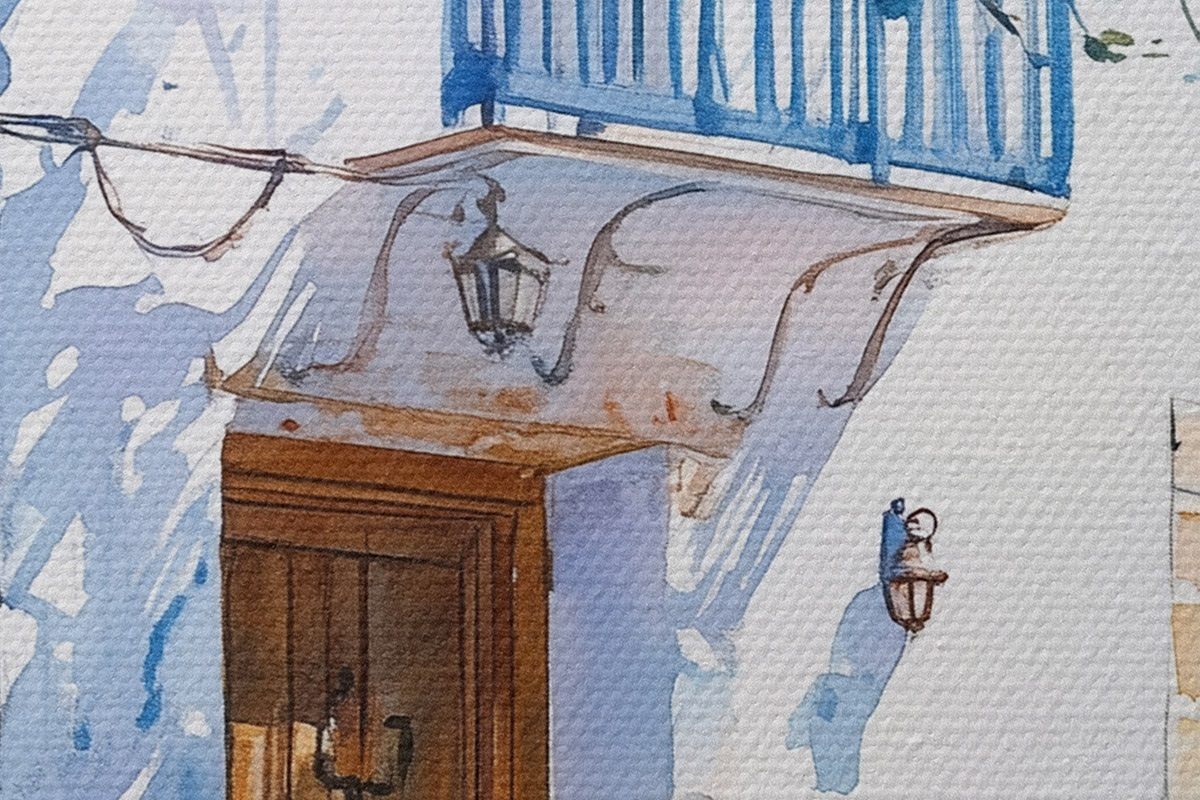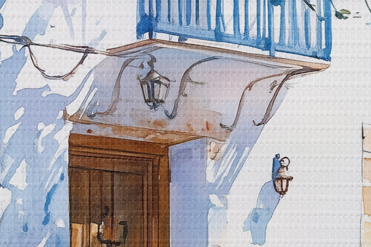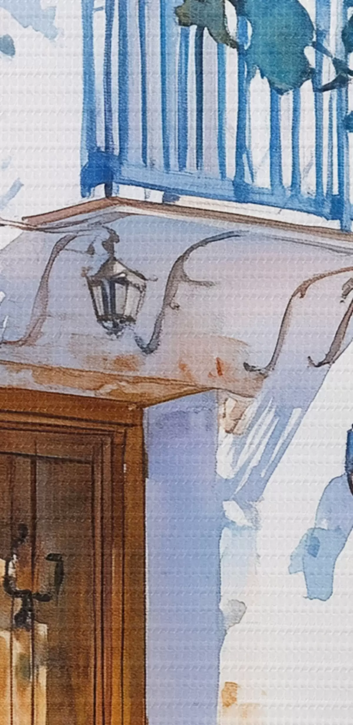 Picturi rotunde Stil acuarelă, casă grecească, copac înflorit, arhitectură Nr r43182