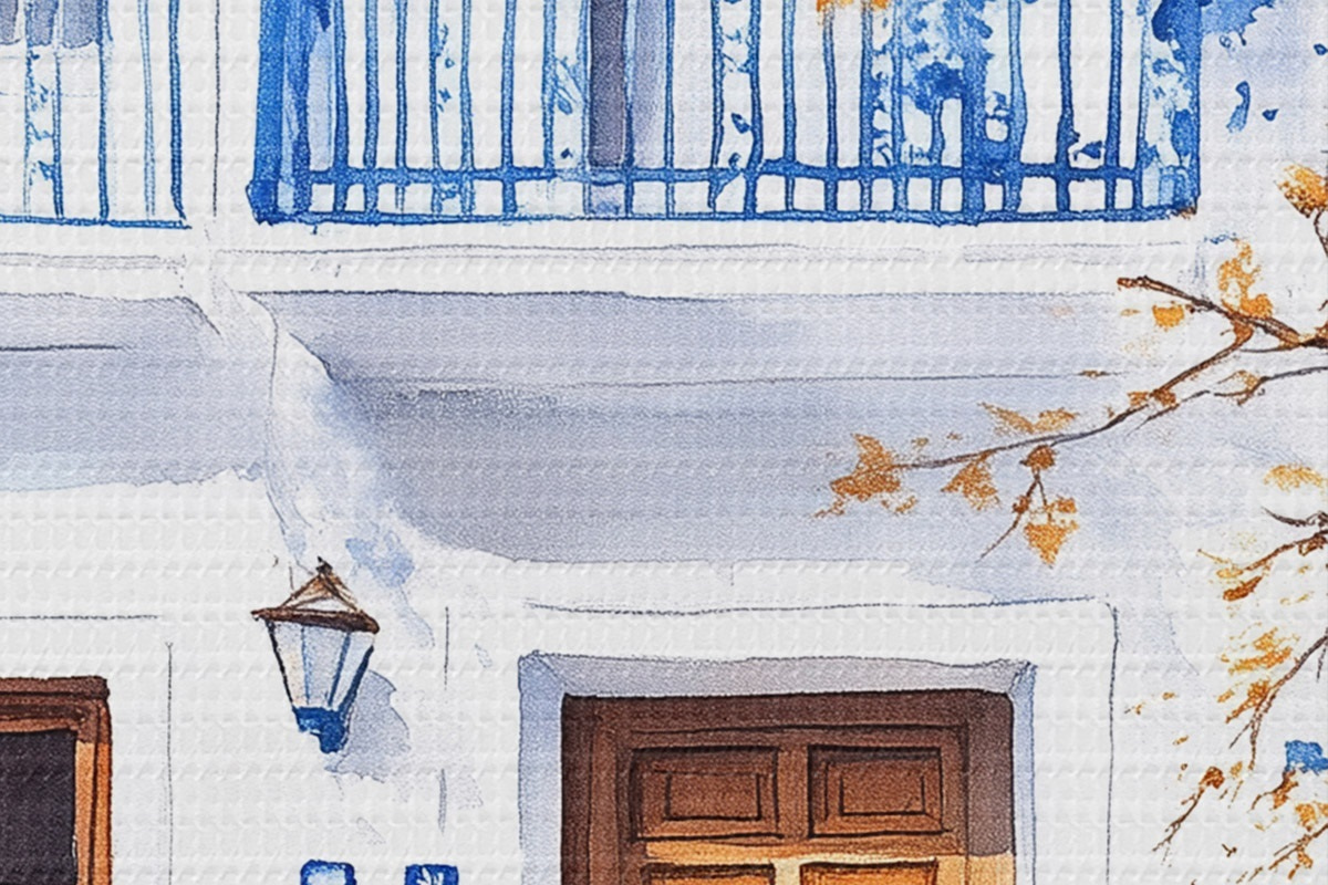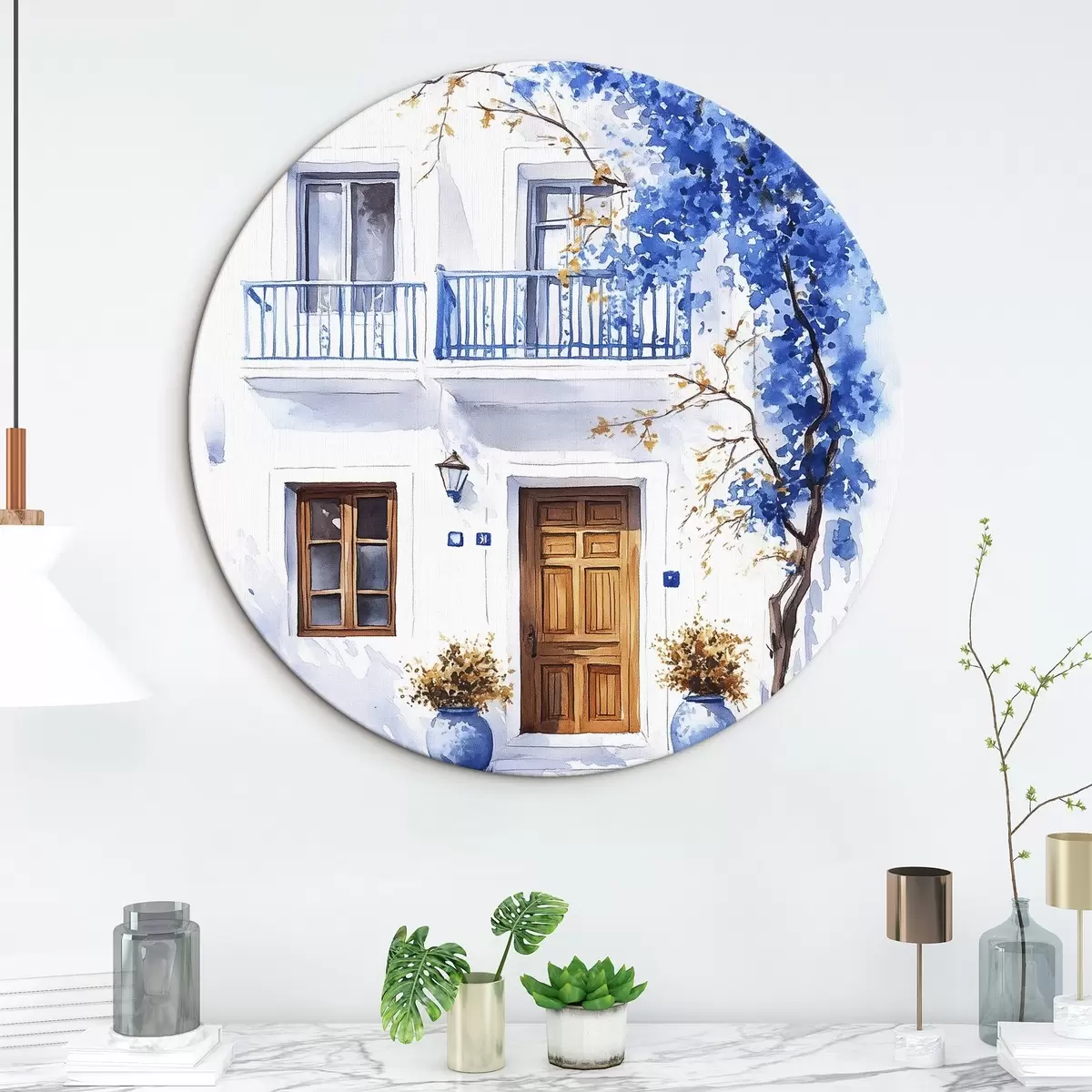 Picturi rotunde Copac înflorit cu flori albastre, casă albă, Grecia, stil acuarelă r43183