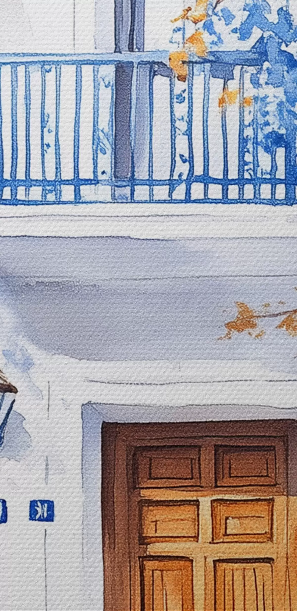 Picturi rotunde Copac înflorit cu flori albastre, casă albă, Grecia, stil acuarelă Nr r43183