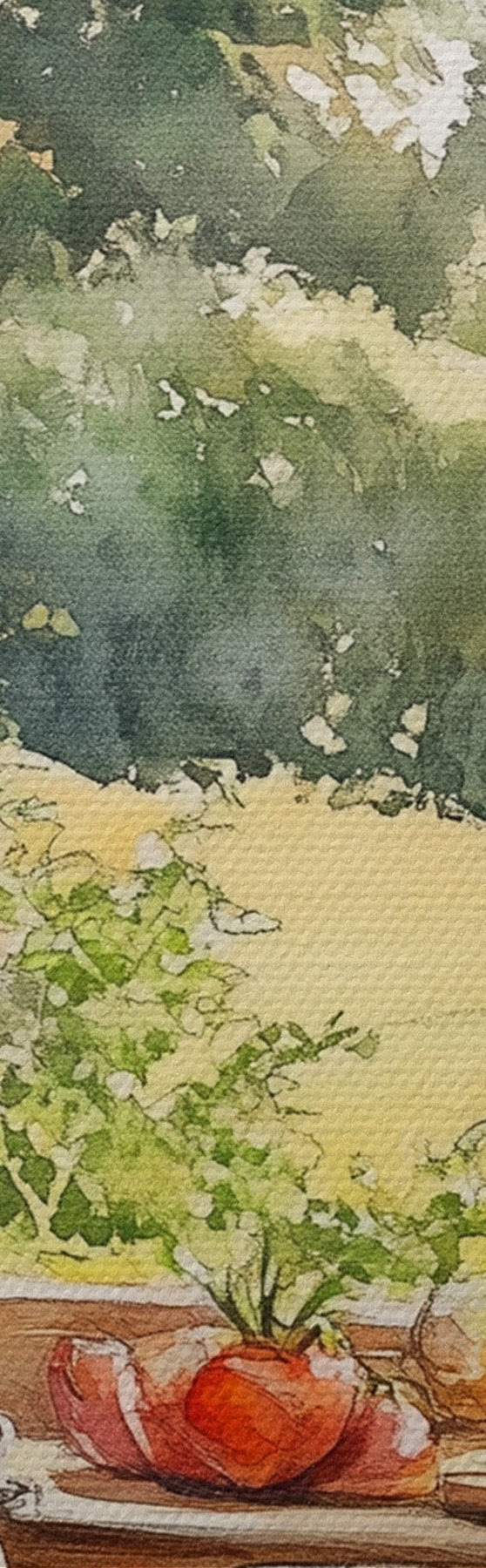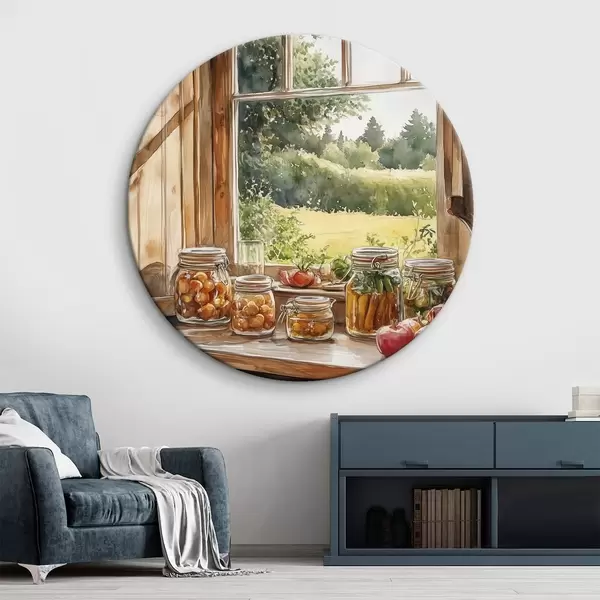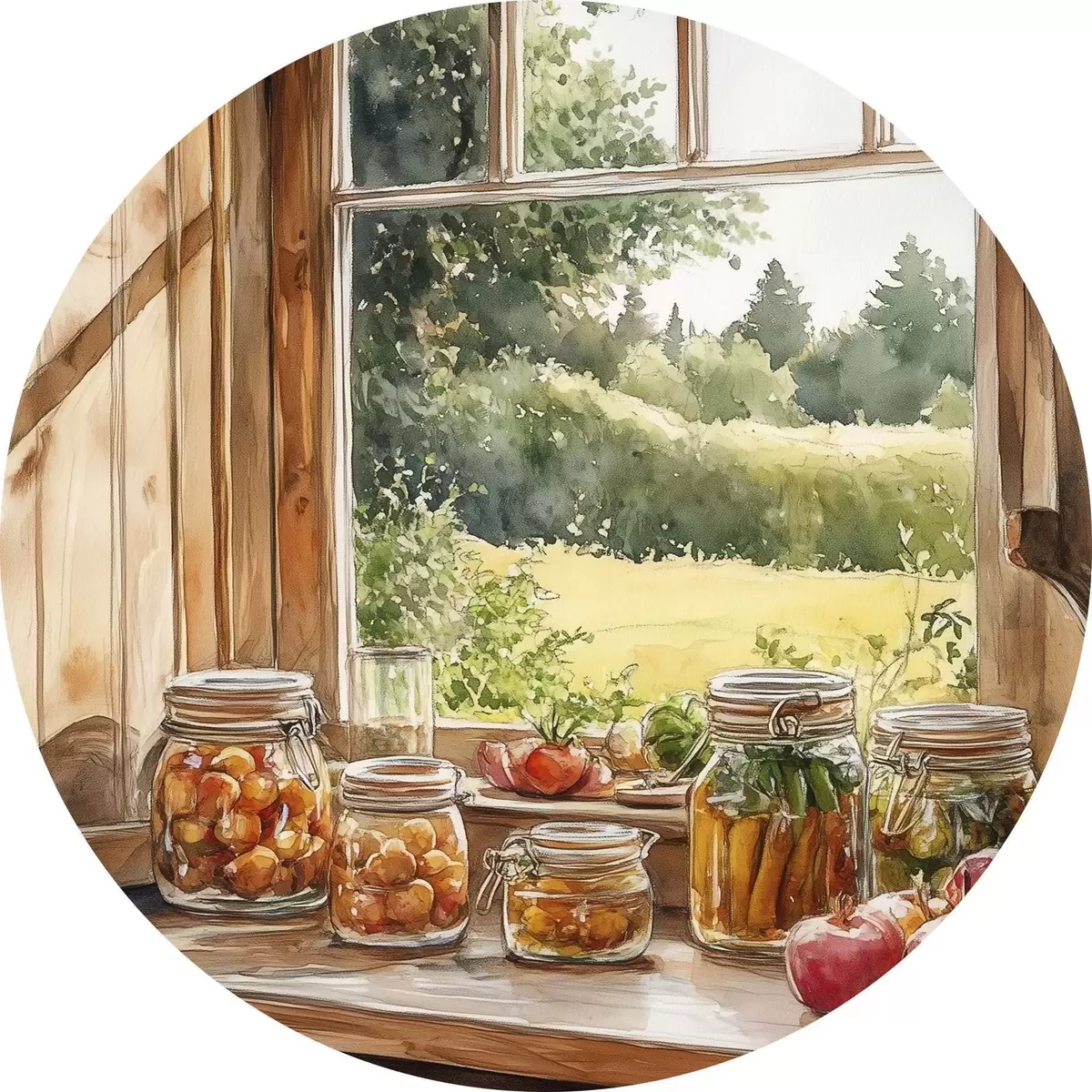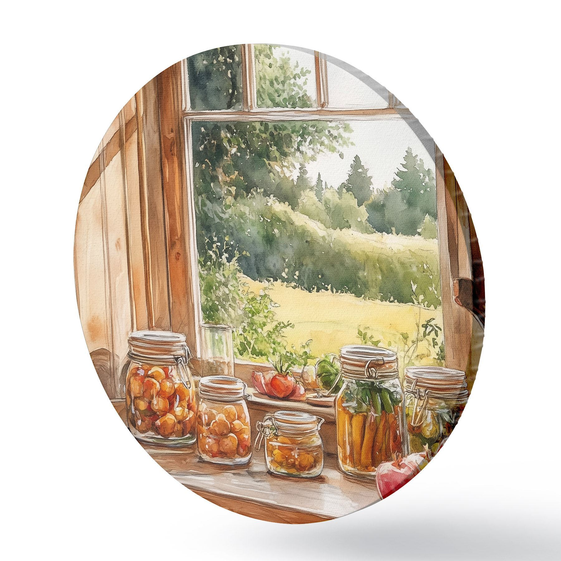 Picturi rotunde Estetica satului, casa din lemn, natura de vara, legume, stil acuarelă r43185