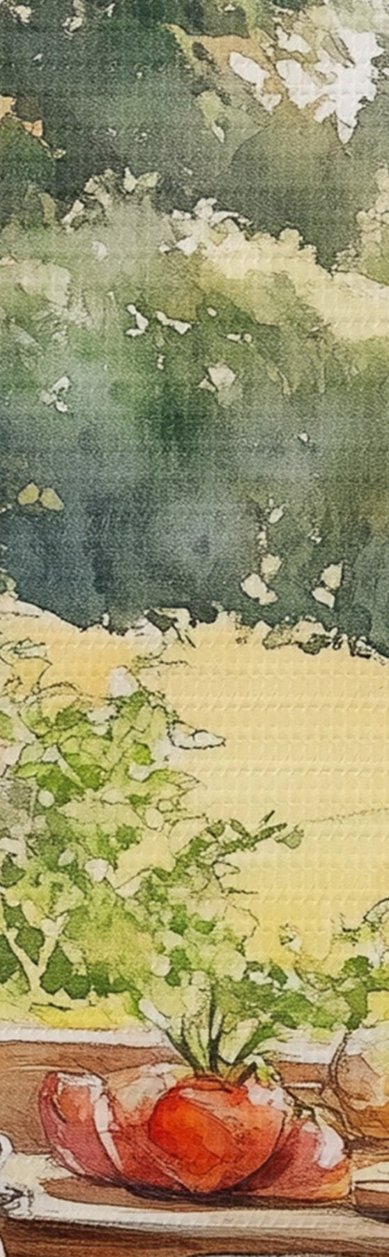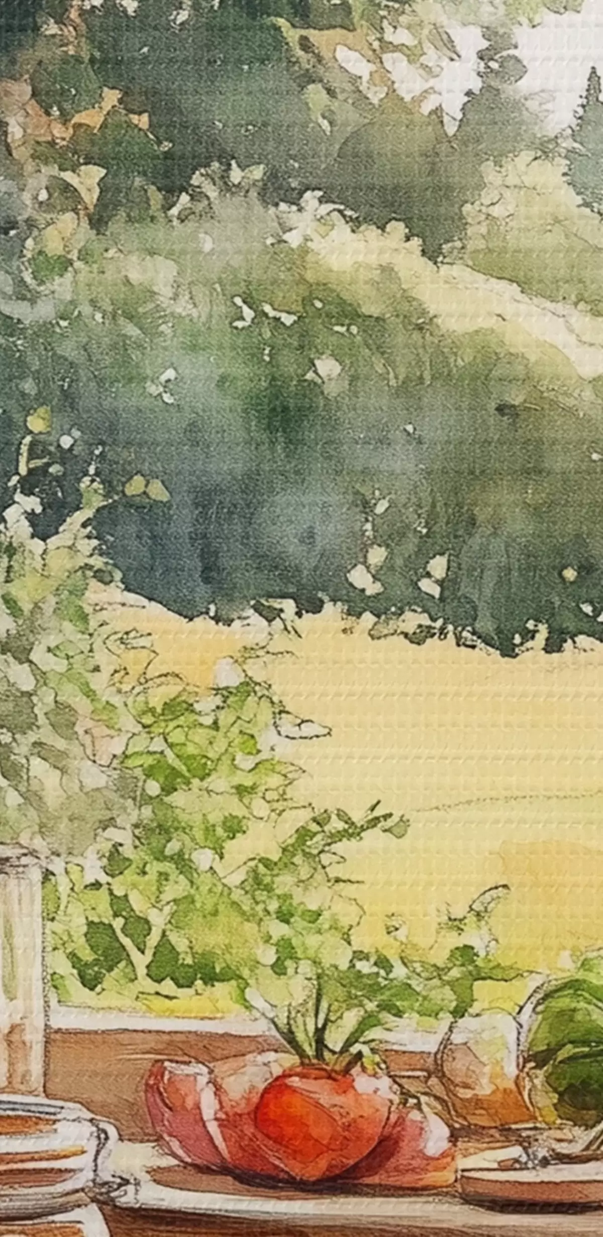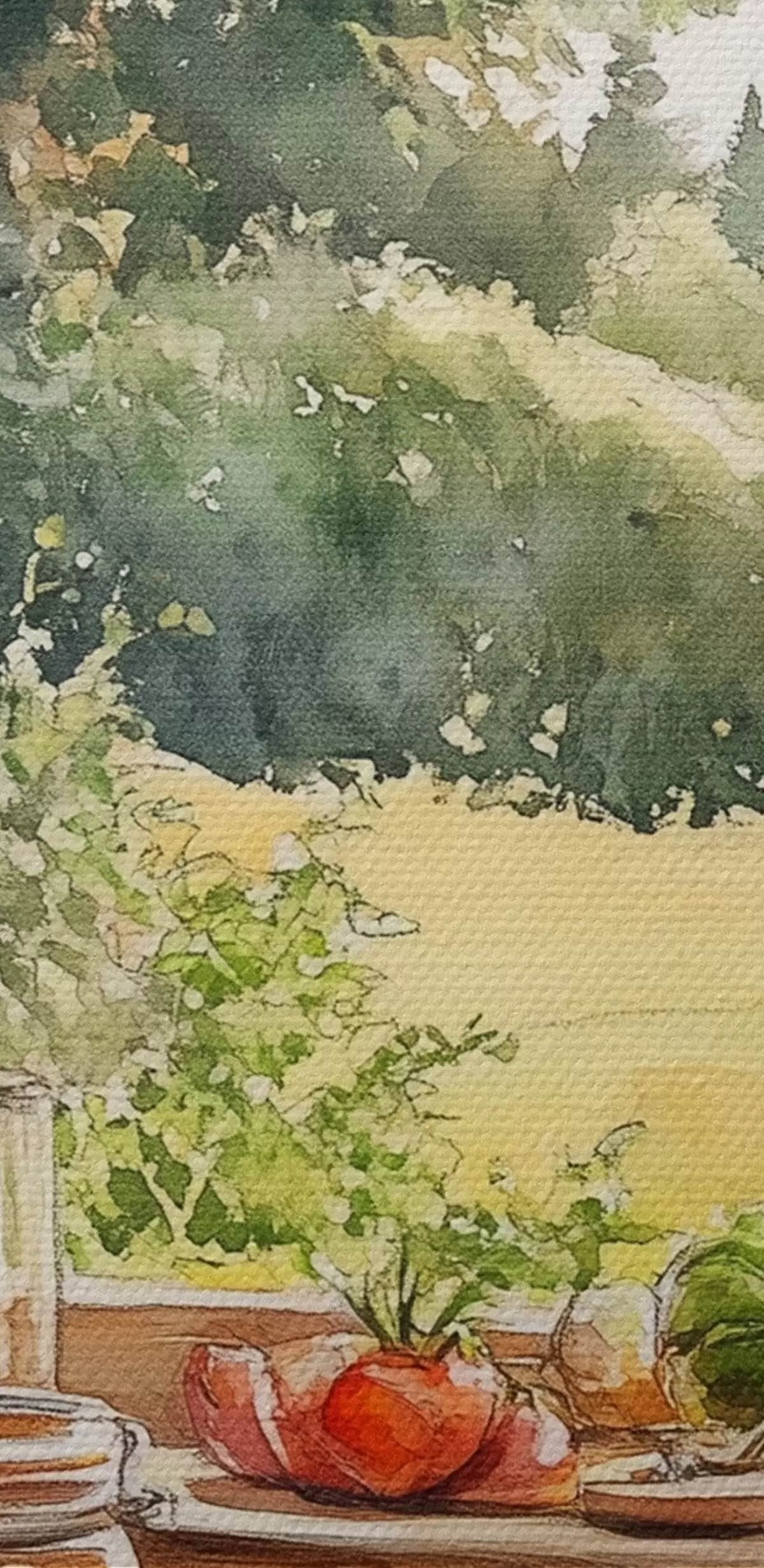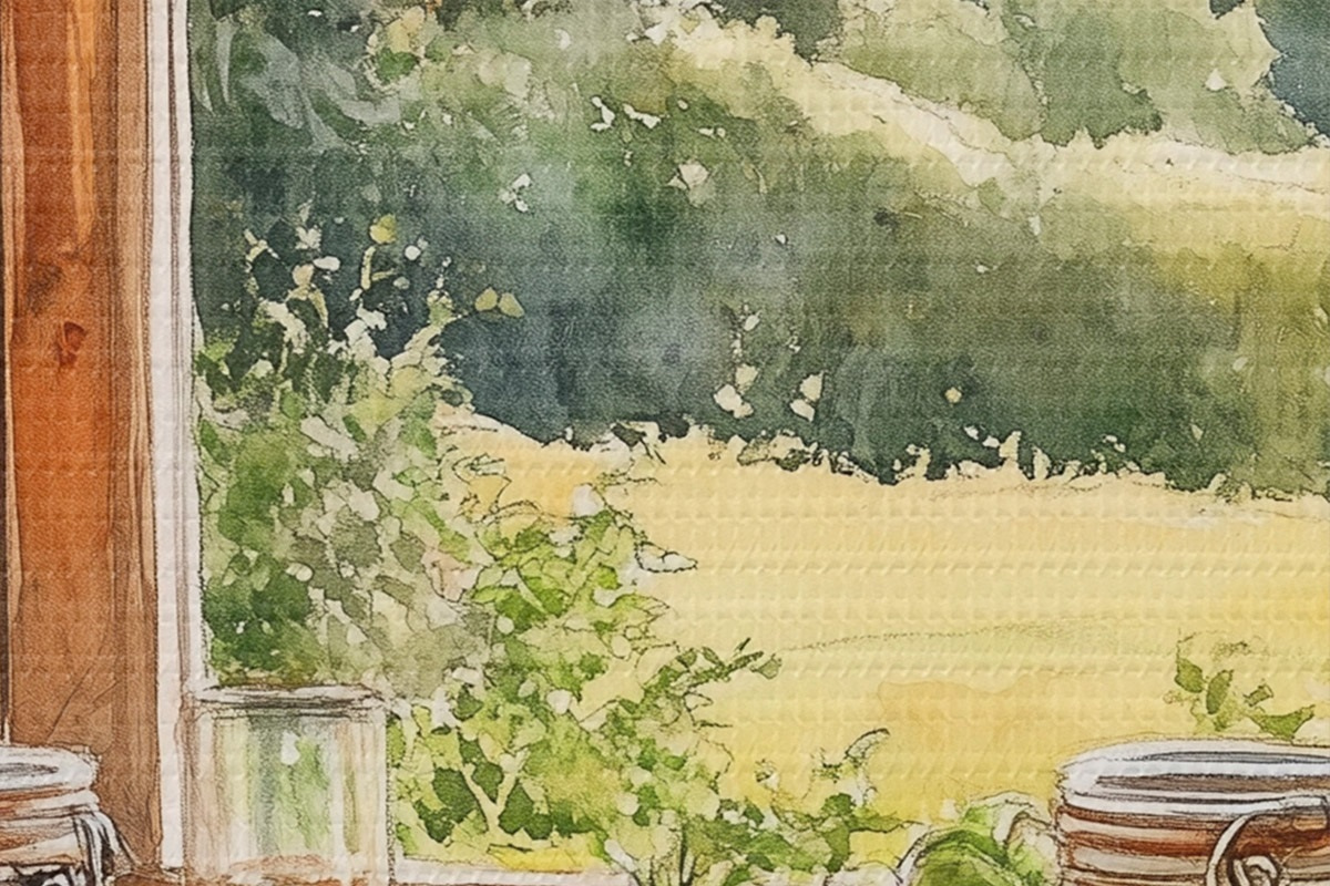 Picturi rotunde Estetica satului, casa din lemn, natura de vara, legume, stil acuarelă r43185