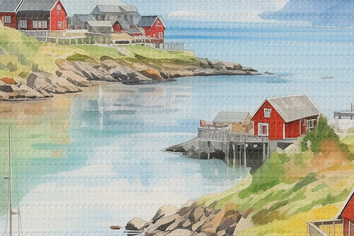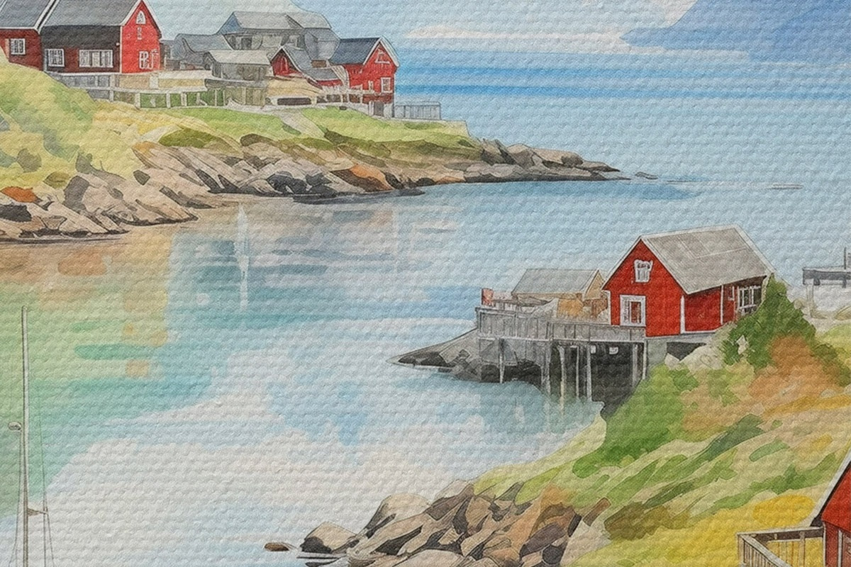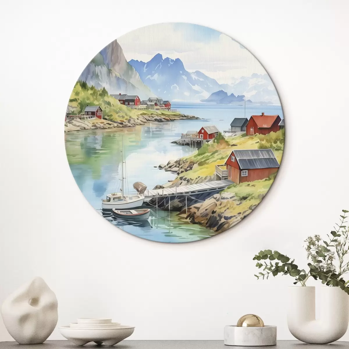 Picturi rotunde Insulele Lofoten peisaj de vară, case roșii, munți, bărci r43187