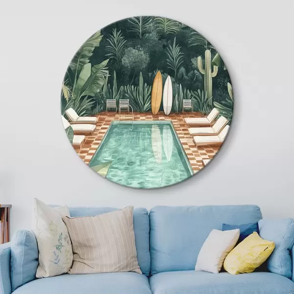 Picturi rotunde Vintage piscină de vară, pădure tropicală, verdeață, palmieri, stil acuarelă Nr r43191