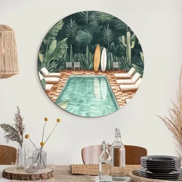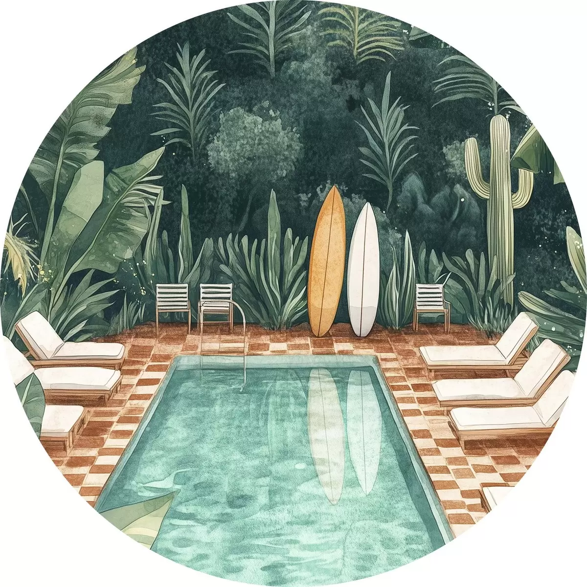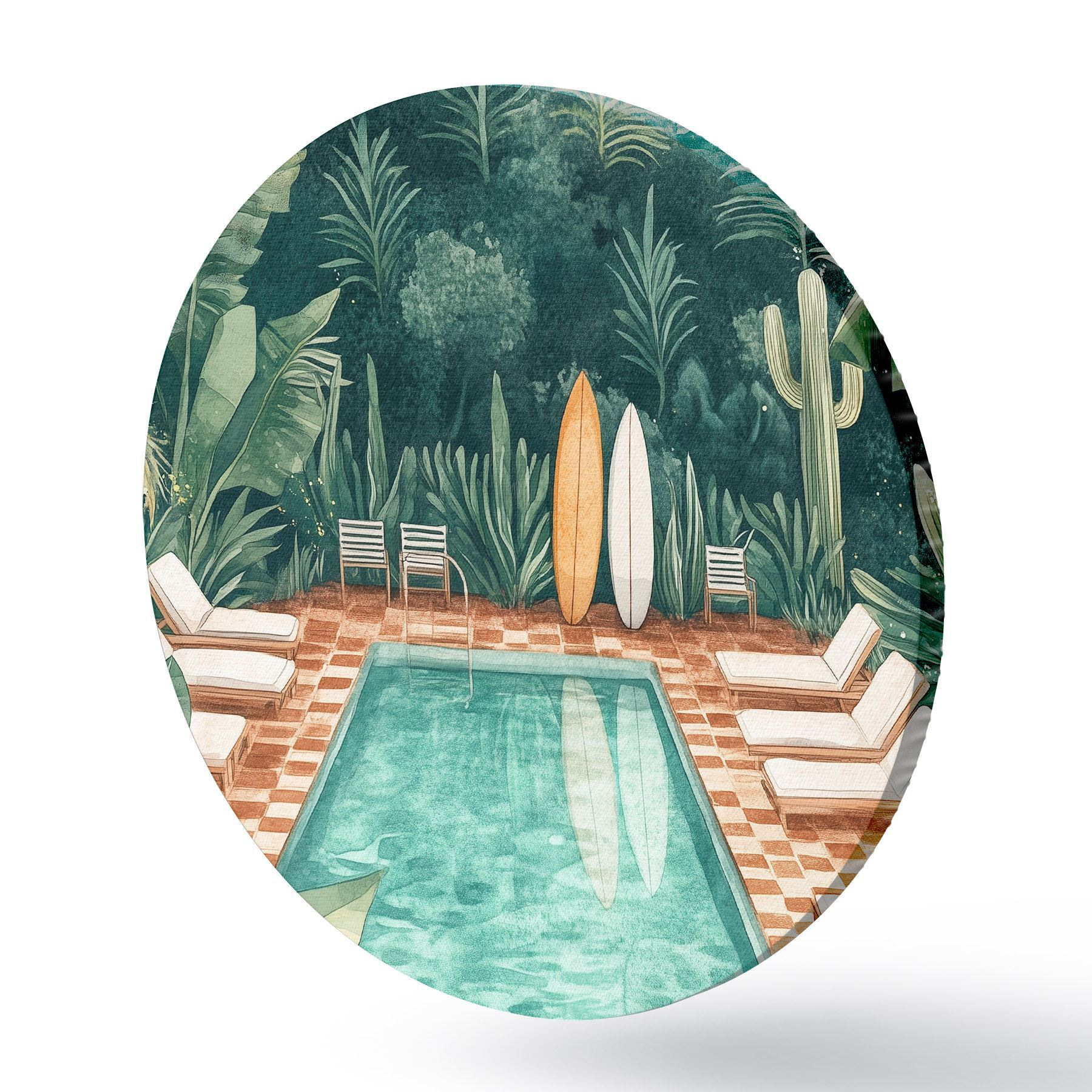 Picturi rotunde Vintage piscină de vară, pădure tropicală, verdeață, palmieri, stil acuarelă Nr r43191