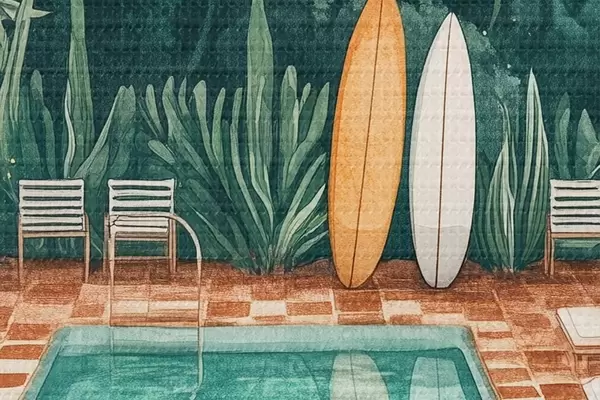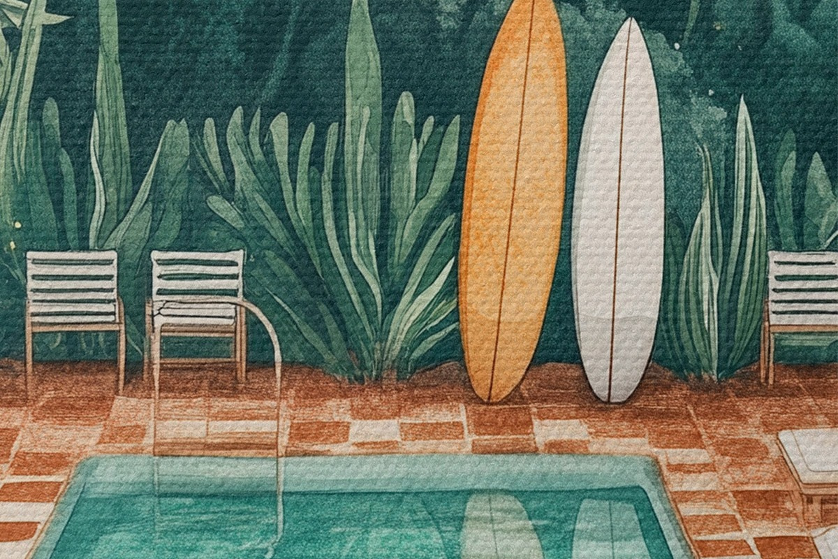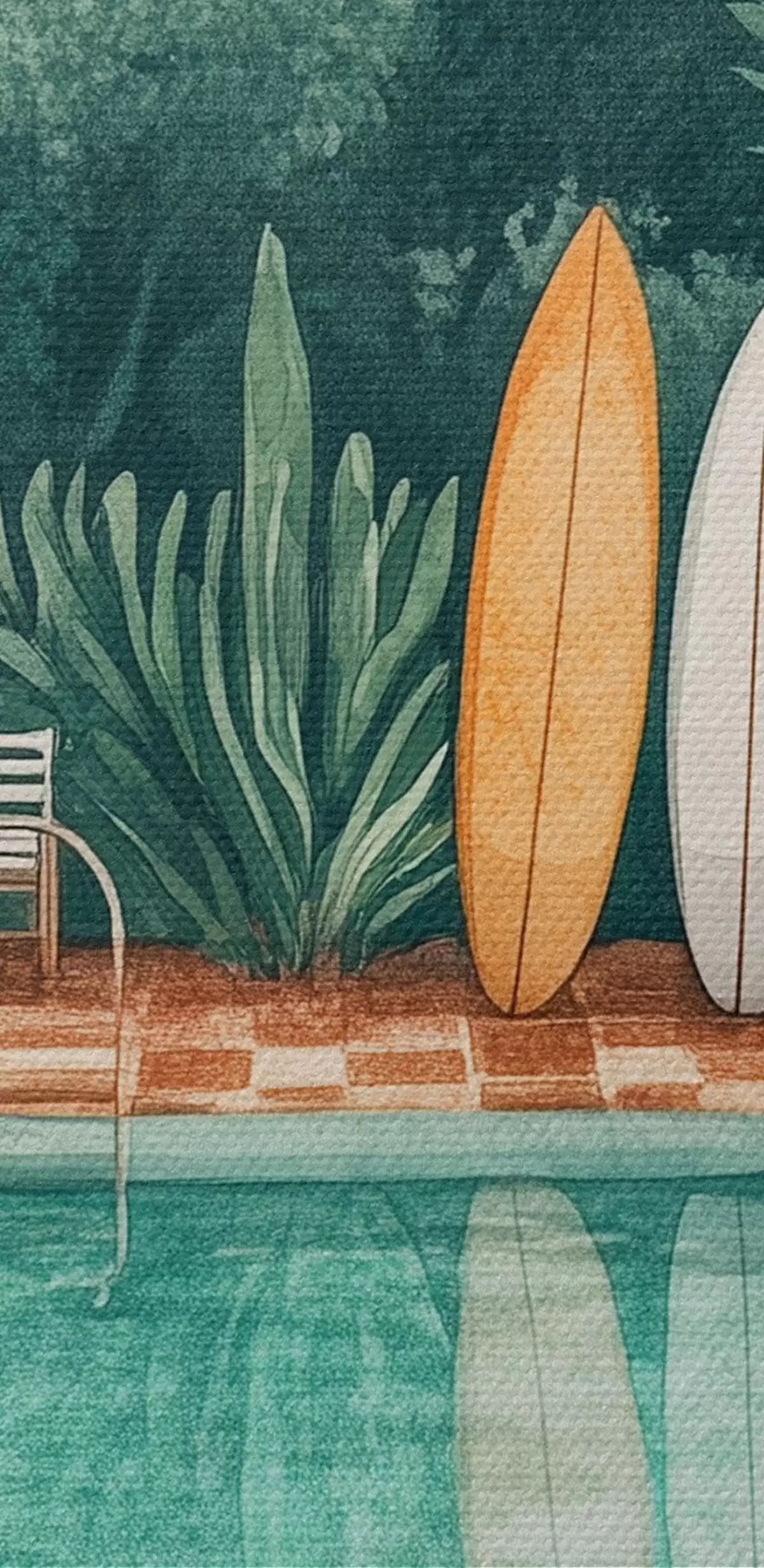 Picturi rotunde Vintage piscină de vară, pădure tropicală, verdeață, palmieri, stil acuarelă r43191