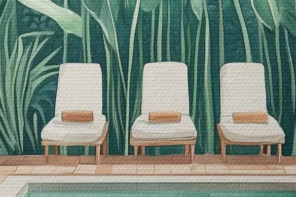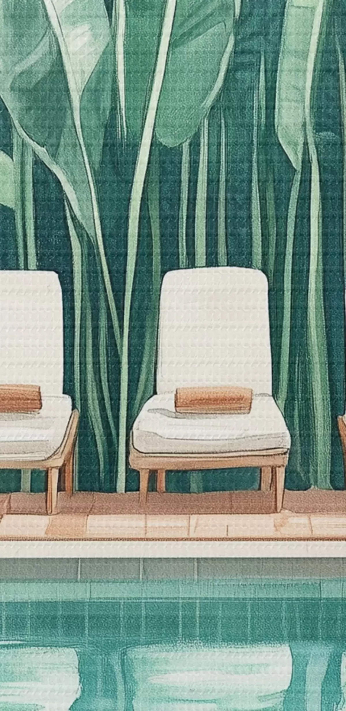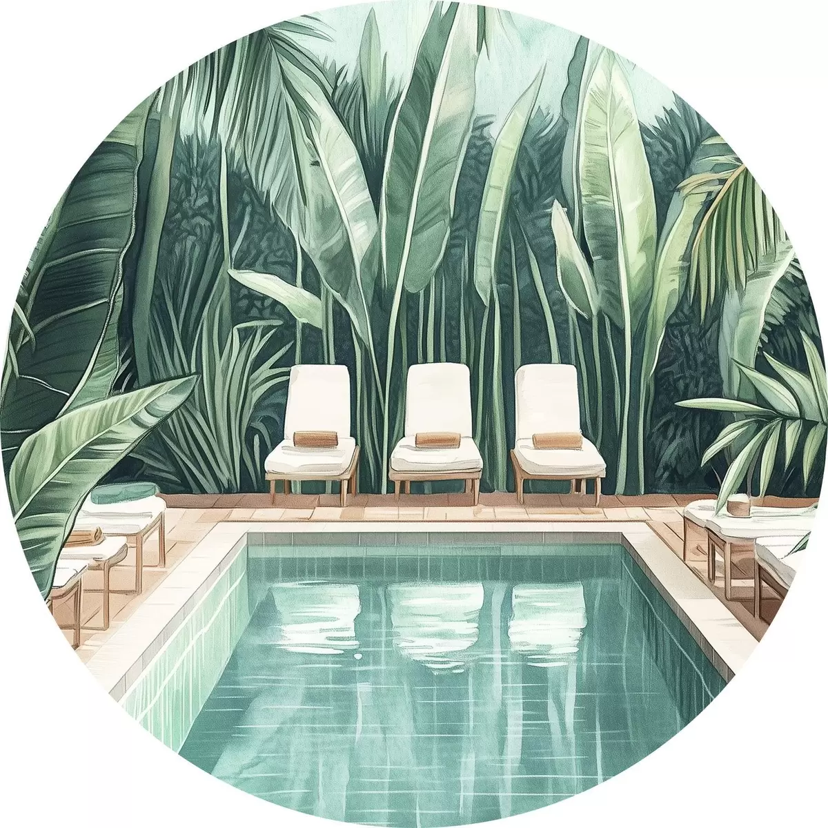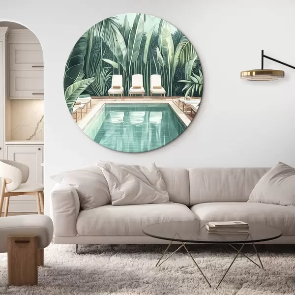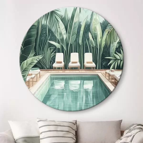 Picturi rotunde Piscină de vară estetică în grădina tropicală, stil acuarelă Nr r43192