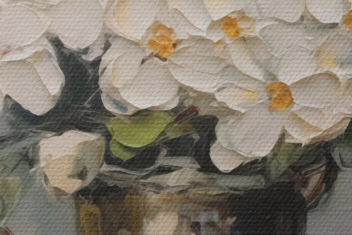 Trei tipuri de materiale sunt disponibile pentru comandă: Economic Canvas - un material dens și durabil pentru imprimarea digitală, identic cu pânza de pictor, suprafață impermeabilă, reproducere realistă a detaliilor, material cu granulație medie. Premium Canvas - textura seamănă cu cea a pânzei unui pictor (fire mici împletite). Reproducere moale, detaliată a imaginii pe o suprafață mată. Eco-Premium - țesătură 100% bumbac de înaltă calitate. Datorită fibrelor naturale de bumbac, materialul este durabil și rezistent la uzură. Reproducere excelentă a culorilor și a detaliilor.