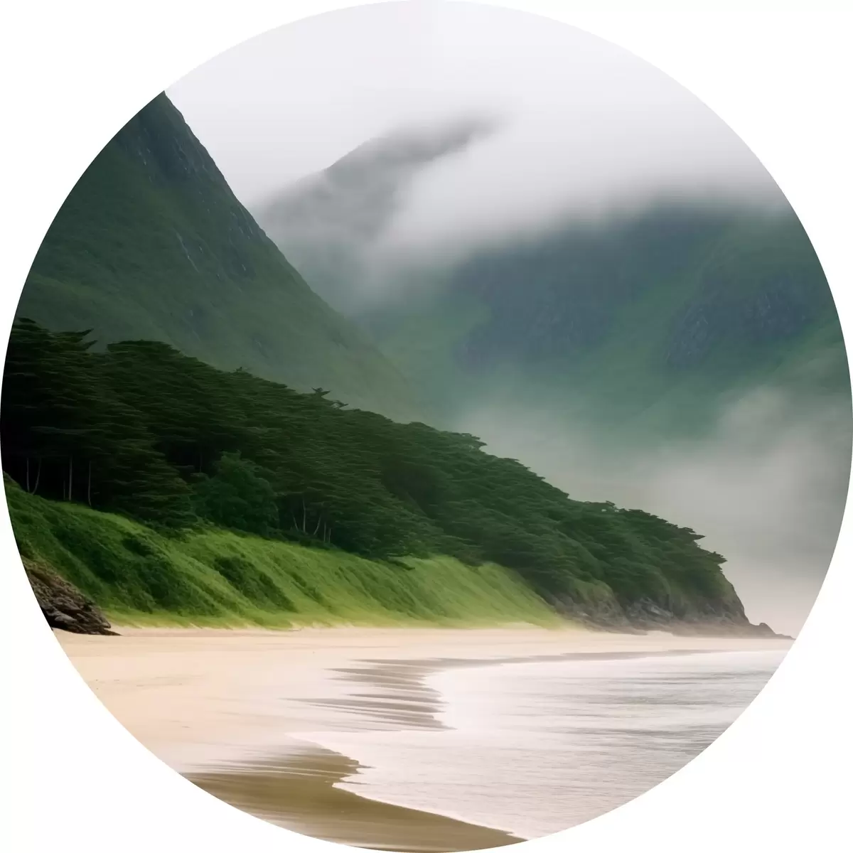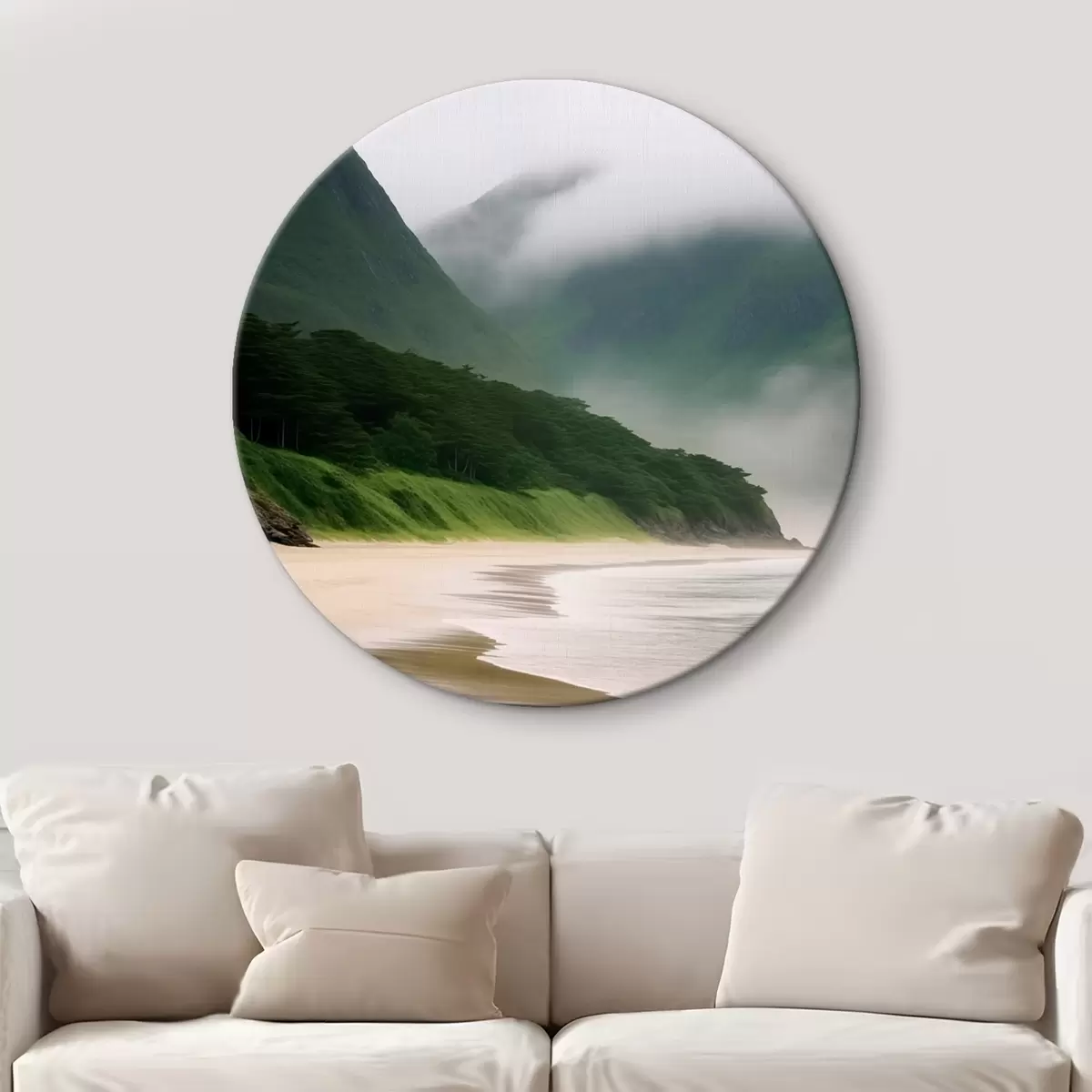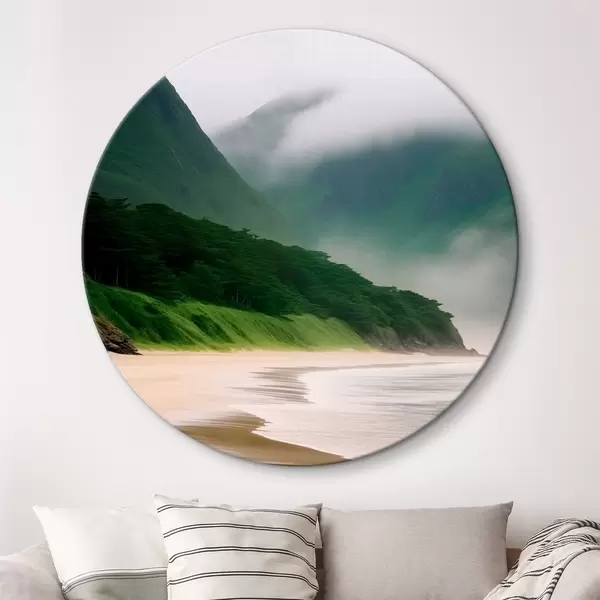 Picturi rotunde Plajă cețoasă lângă pante verzi r43271