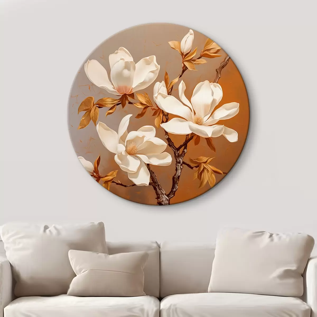 Picturi rotunde Stil pictură în ulei cu o magnolie albă pe o ramură pe un fundal galben r43361