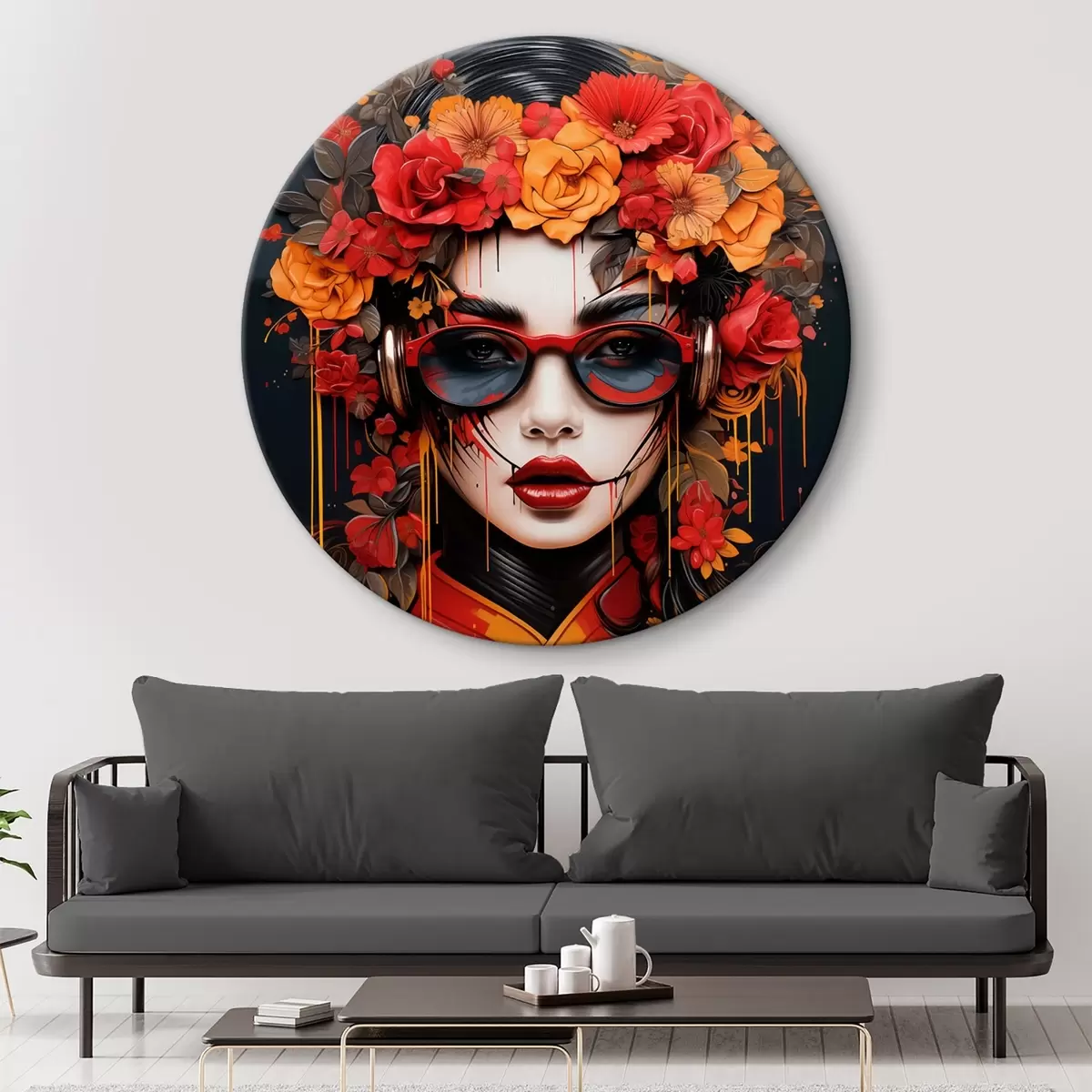 Picturi rotunde Femeie cu flori pe cap, stil street art Nr r43362