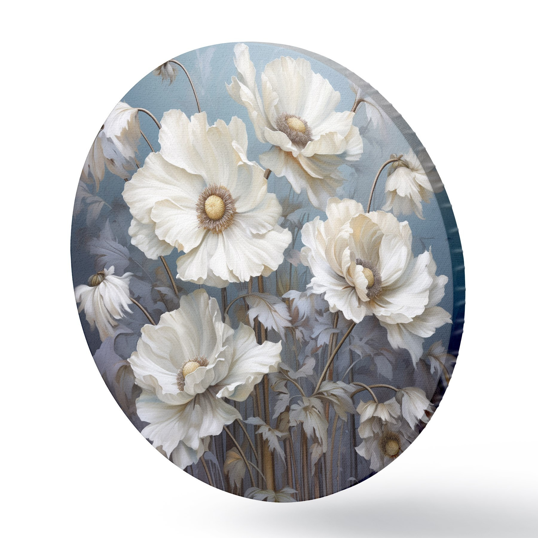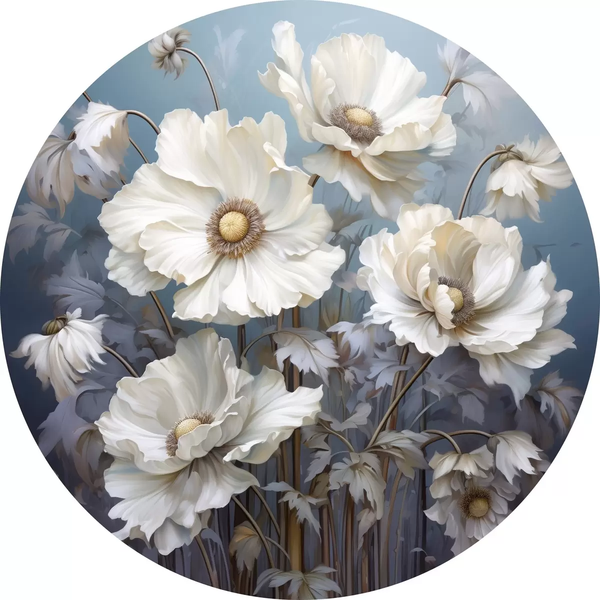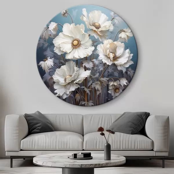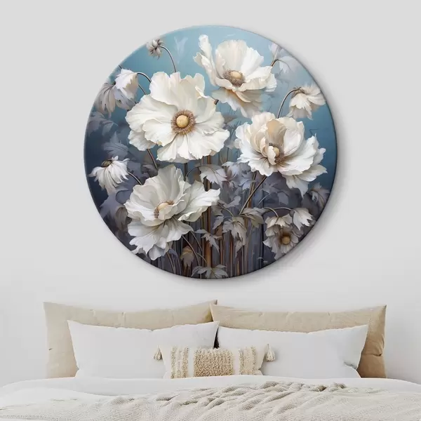 Picturi rotunde Buchet alb de bujori pe un fundal albastru în stil pictură Nr r43370