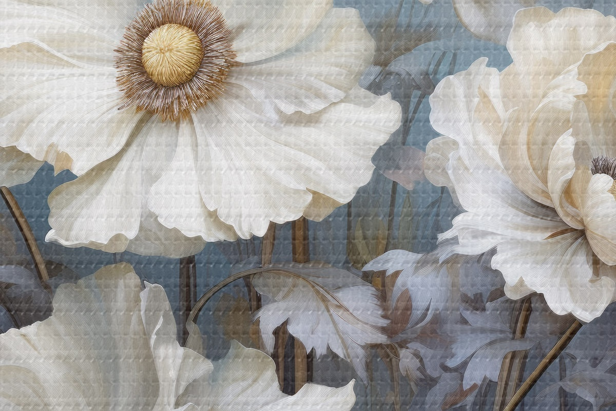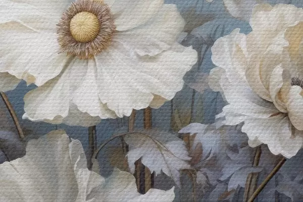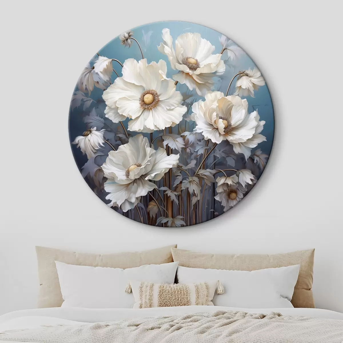Picturi rotunde Buchet alb de bujori pe un fundal albastru în stil pictură r43370