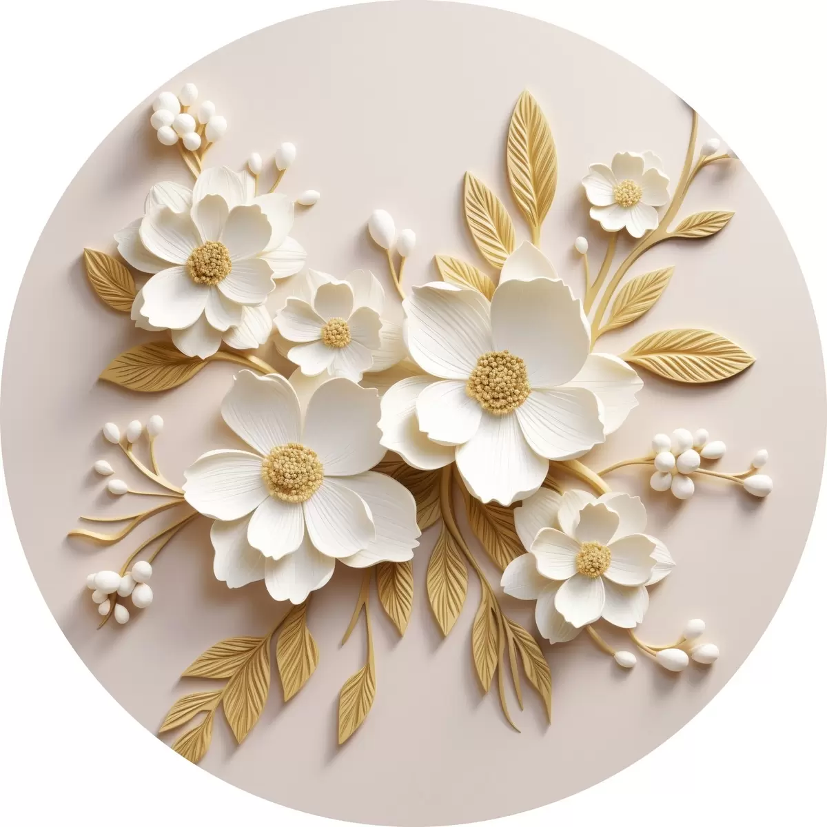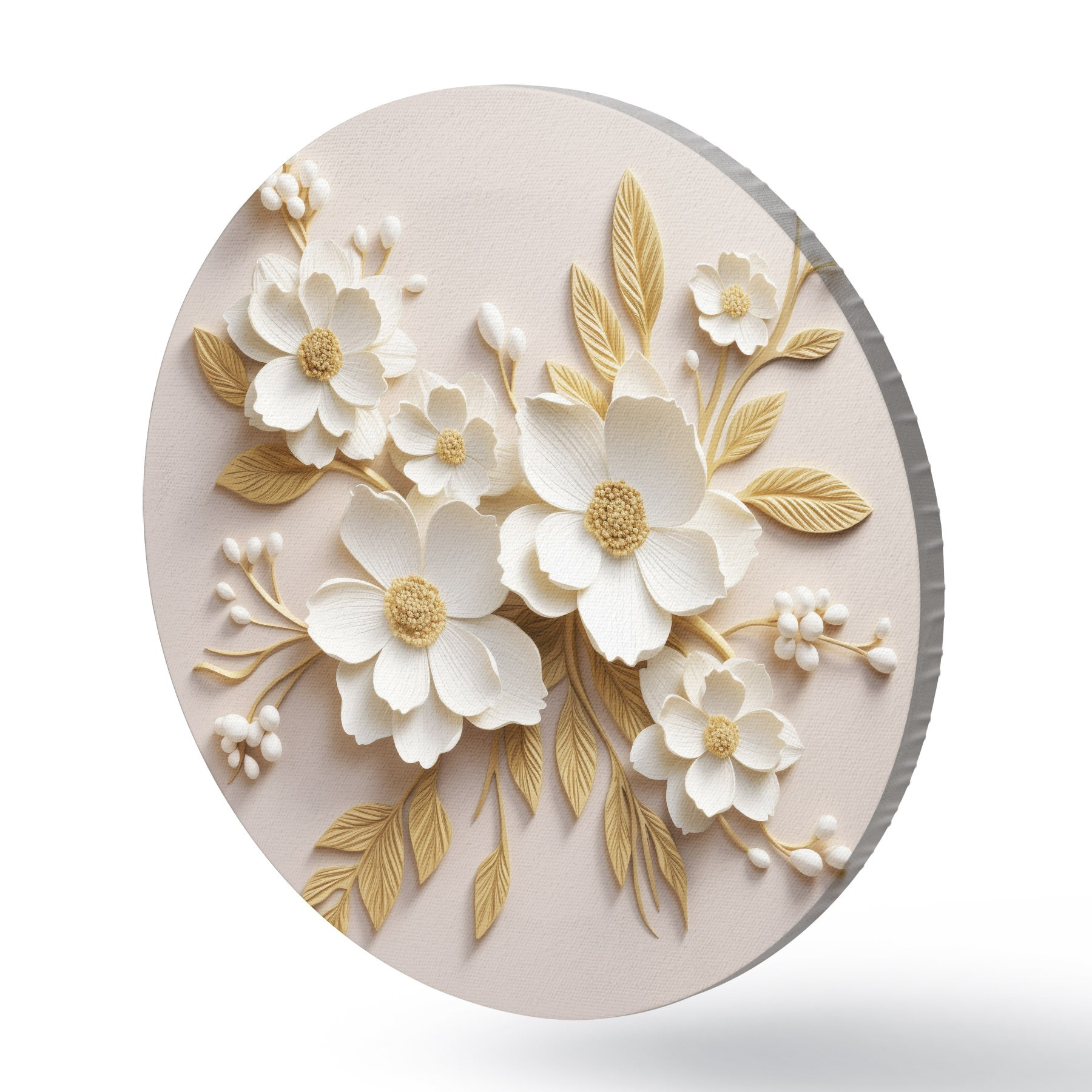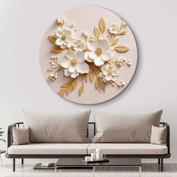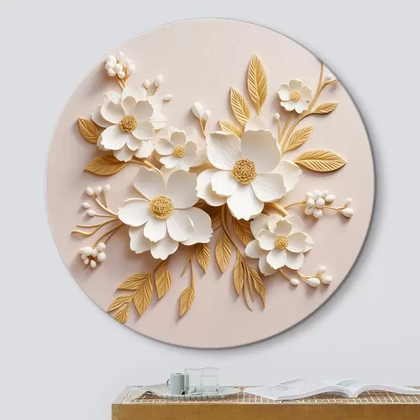 Picturi rotunde flori albe 3D cu frunze pe un fundal crem Nr r43383