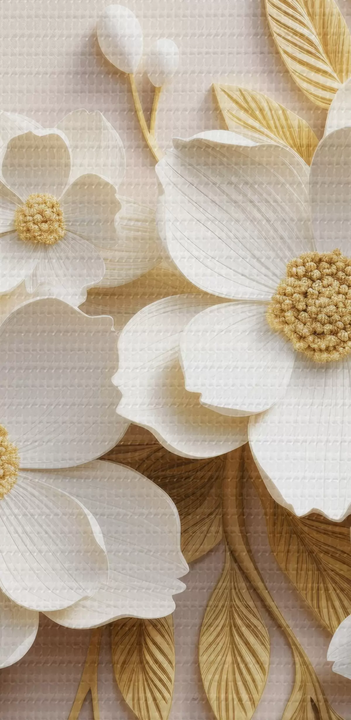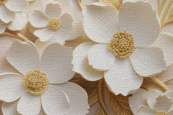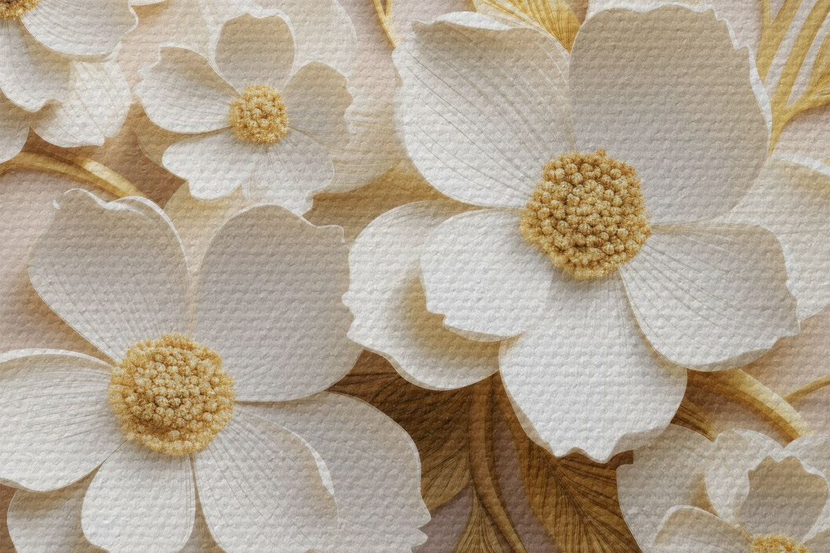 Picturi rotunde flori albe 3D cu frunze pe un fundal crem r43383