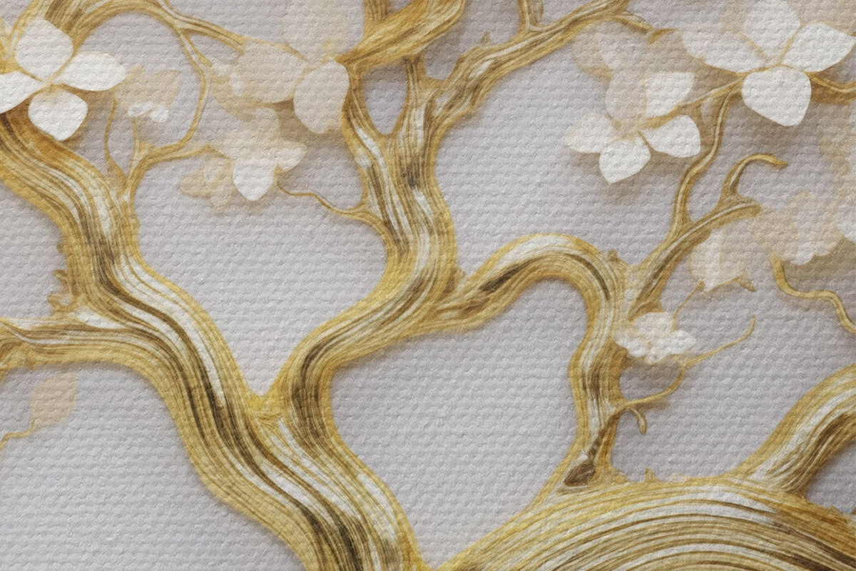 Picturi rotunde Copac decorativ cu flori albe, fundal alb, pietre albe, detalii complicate, artă inspirată din natură r43388