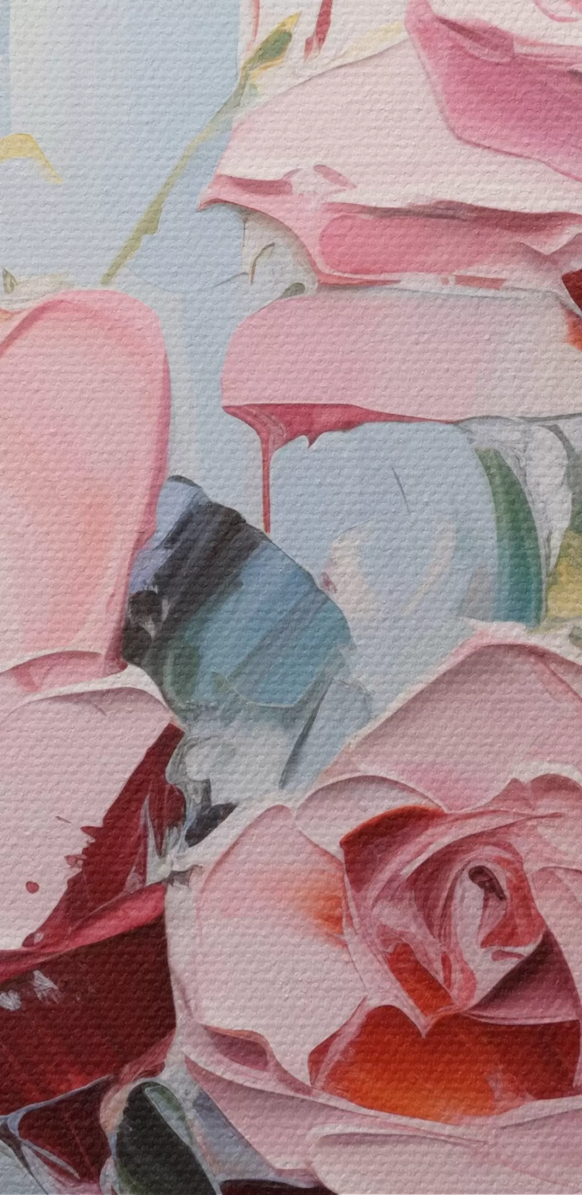 Picturi rotunde Artă abstractă modernă de trandafiri roz și galben cu frunze, tușe groase, imitație de pictură în ulei, culori pastelate Nr r43392