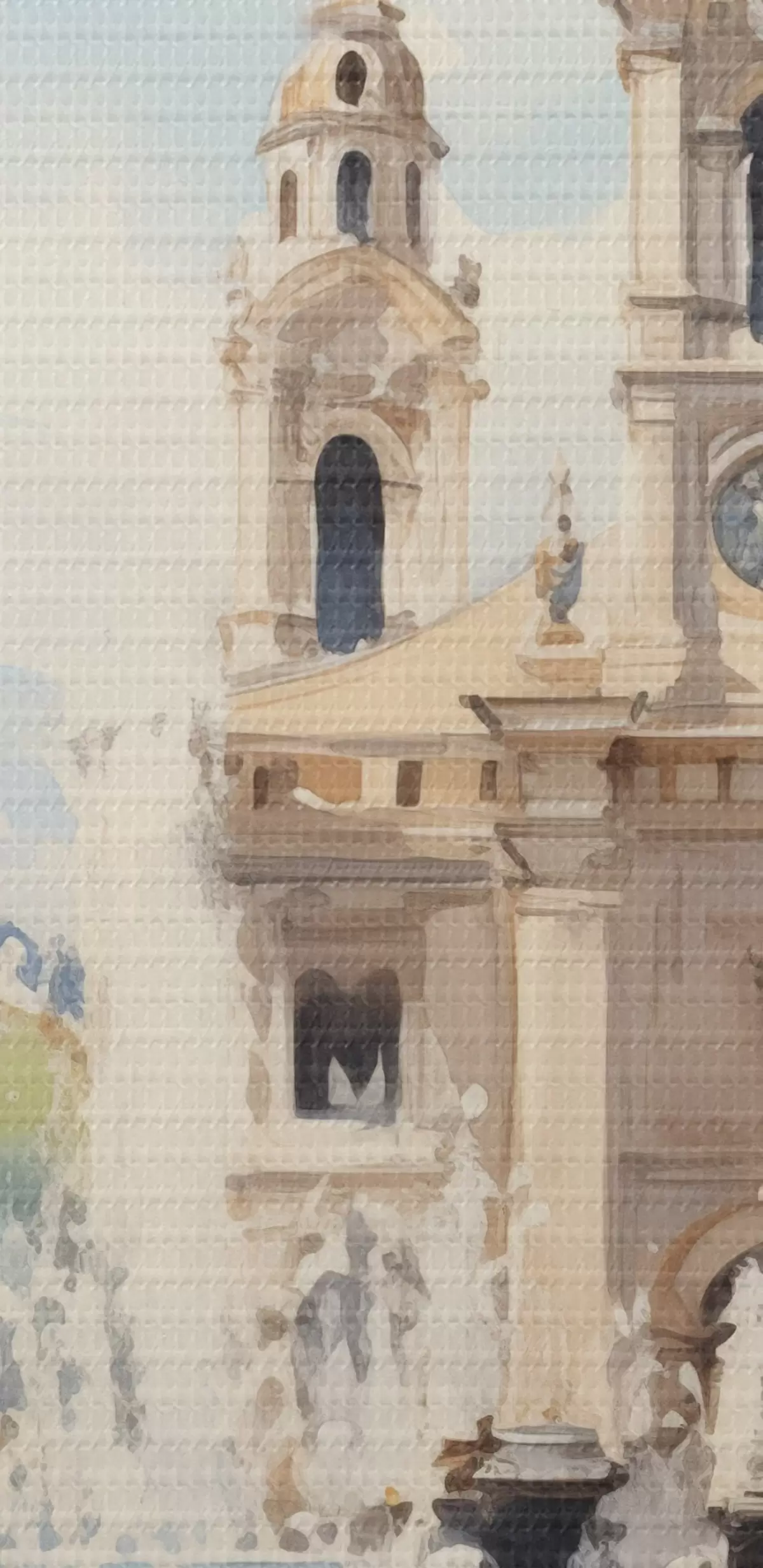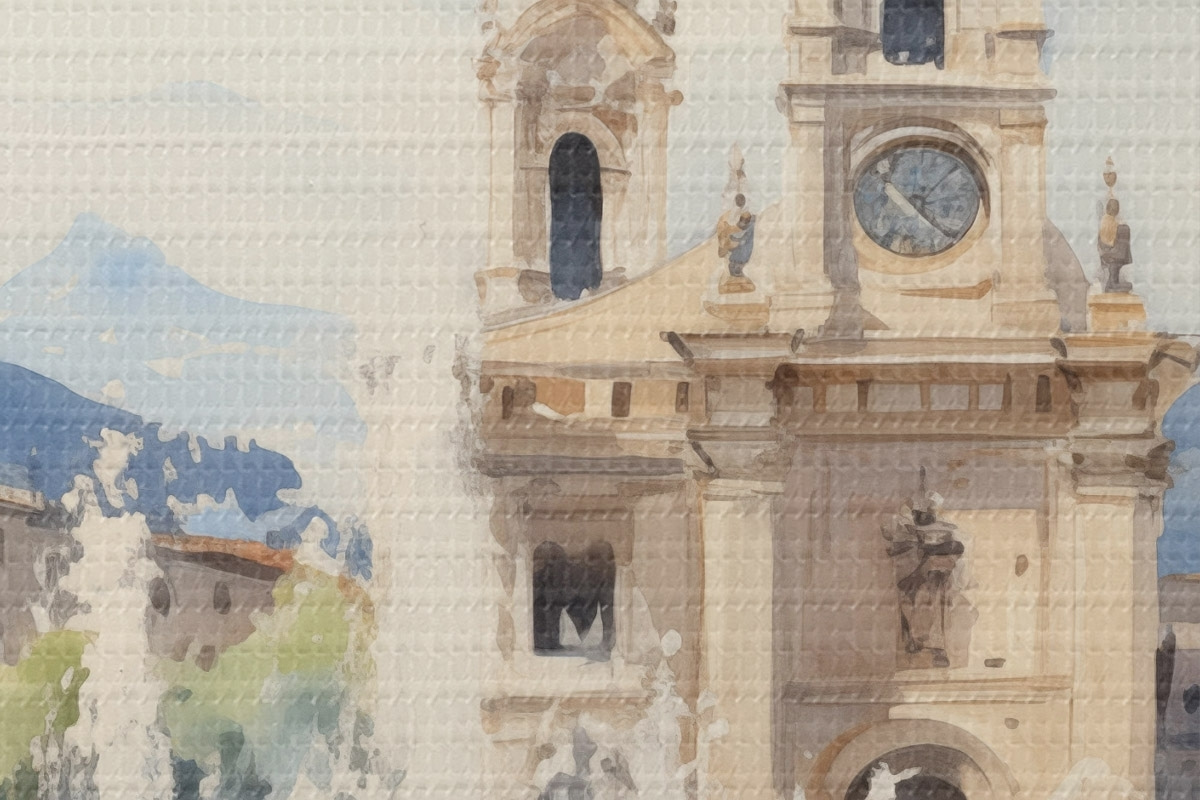 Picturi rotunde Abstract cityscape cu turn și o fântână într-o piață de oraș, munți în depărtare, stil acuarelă r43397