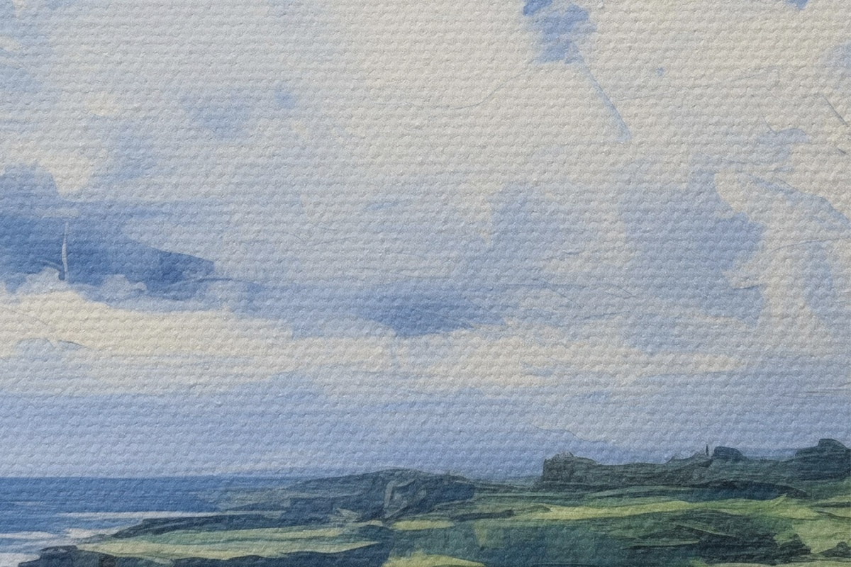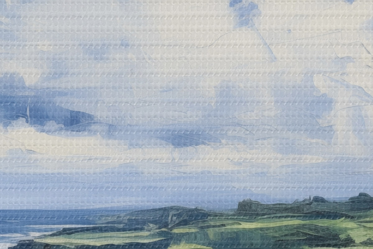 Picturi rotunde Câmp verde cu o stâncă pe coastă, mare albastră cu valuri, cer înnorat, imitație de pictură în ulei modernă minimalistă r43406