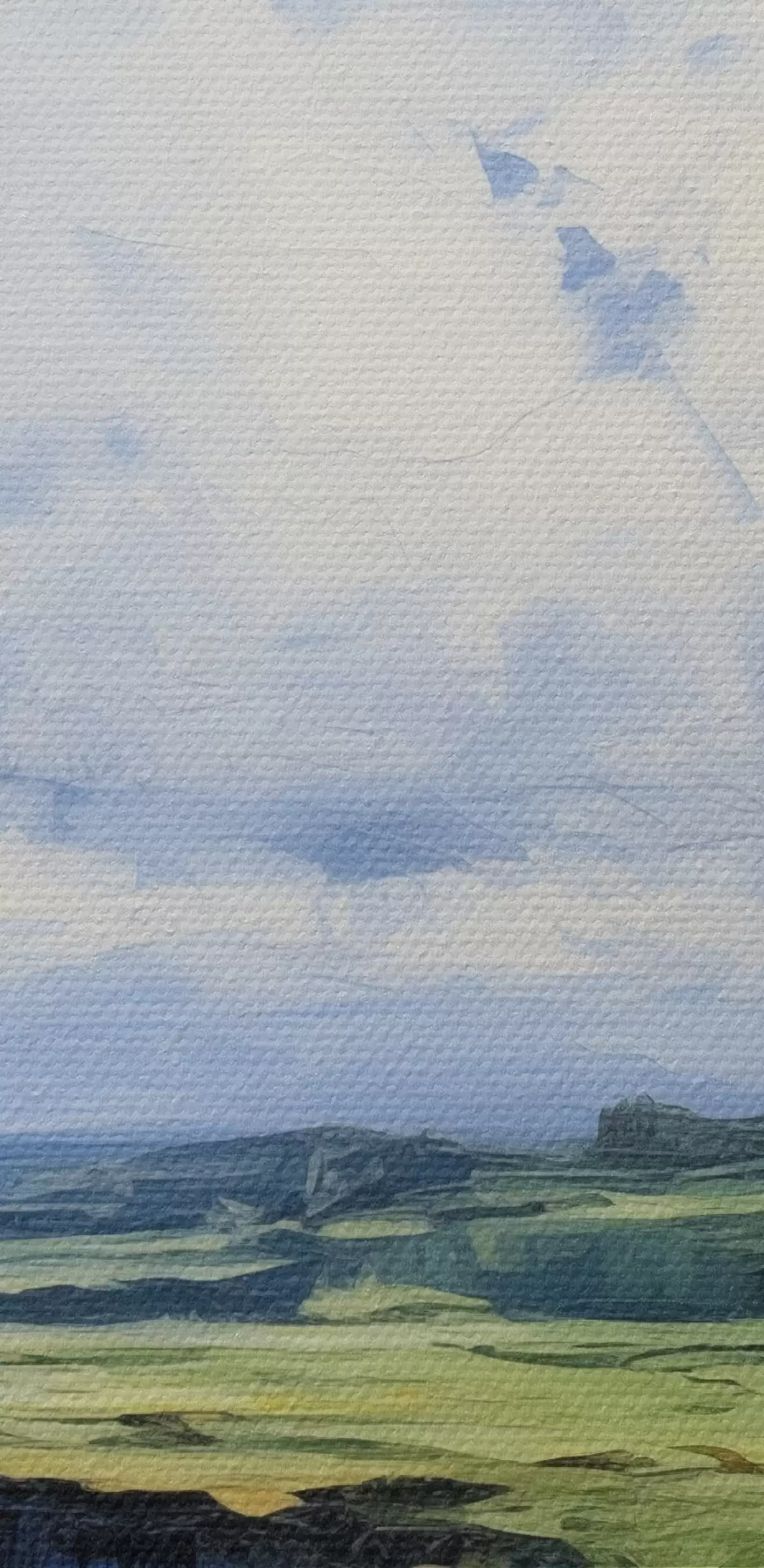 Picturi rotunde Câmp verde cu o stâncă pe coastă, mare albastră cu valuri, cer înnorat, imitație de pictură în ulei modernă minimalistă Nr r43406