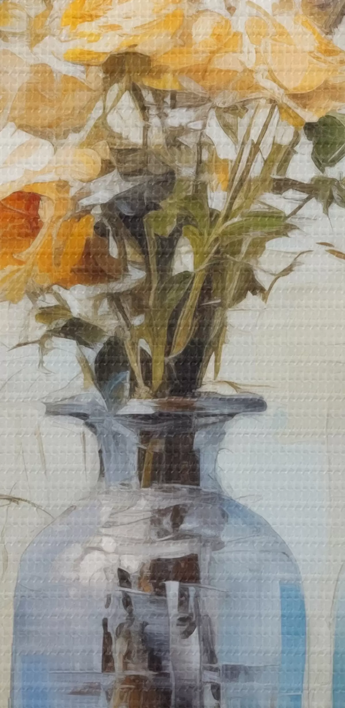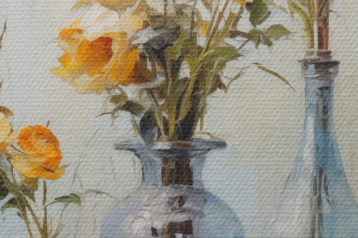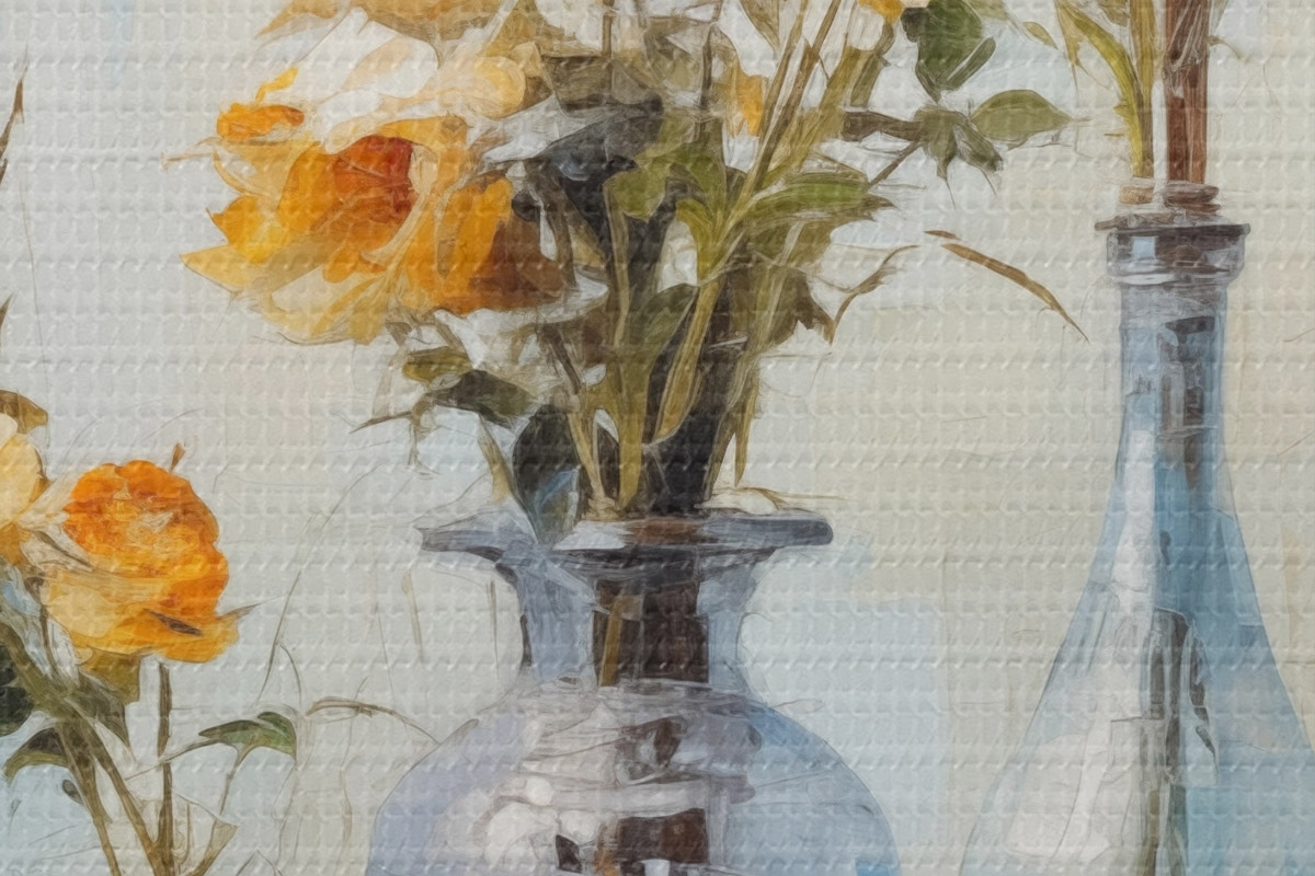 Picturi rotunde O natură moartă de trandafiri galbeni în vaze de sticlă albastră, fundal cu textură ușoară, lovituri de perie moale, stil pictură în ulei Nr r43409