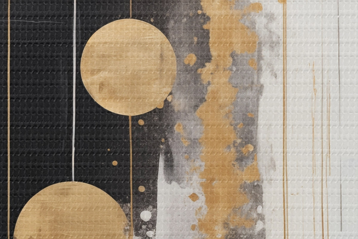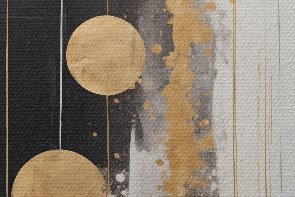 Picturi rotunde Artă abstractă cu cercuri galbene agățate pe fundal alb-negru cu pete albe și galbene Nr r43410