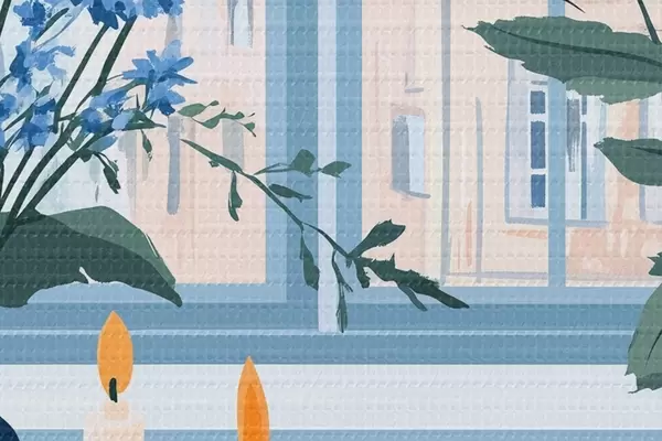 Picturi rotunde Casă confortabilă cu flori și vedere la fereastră, arhitectură, culori albastre r44010