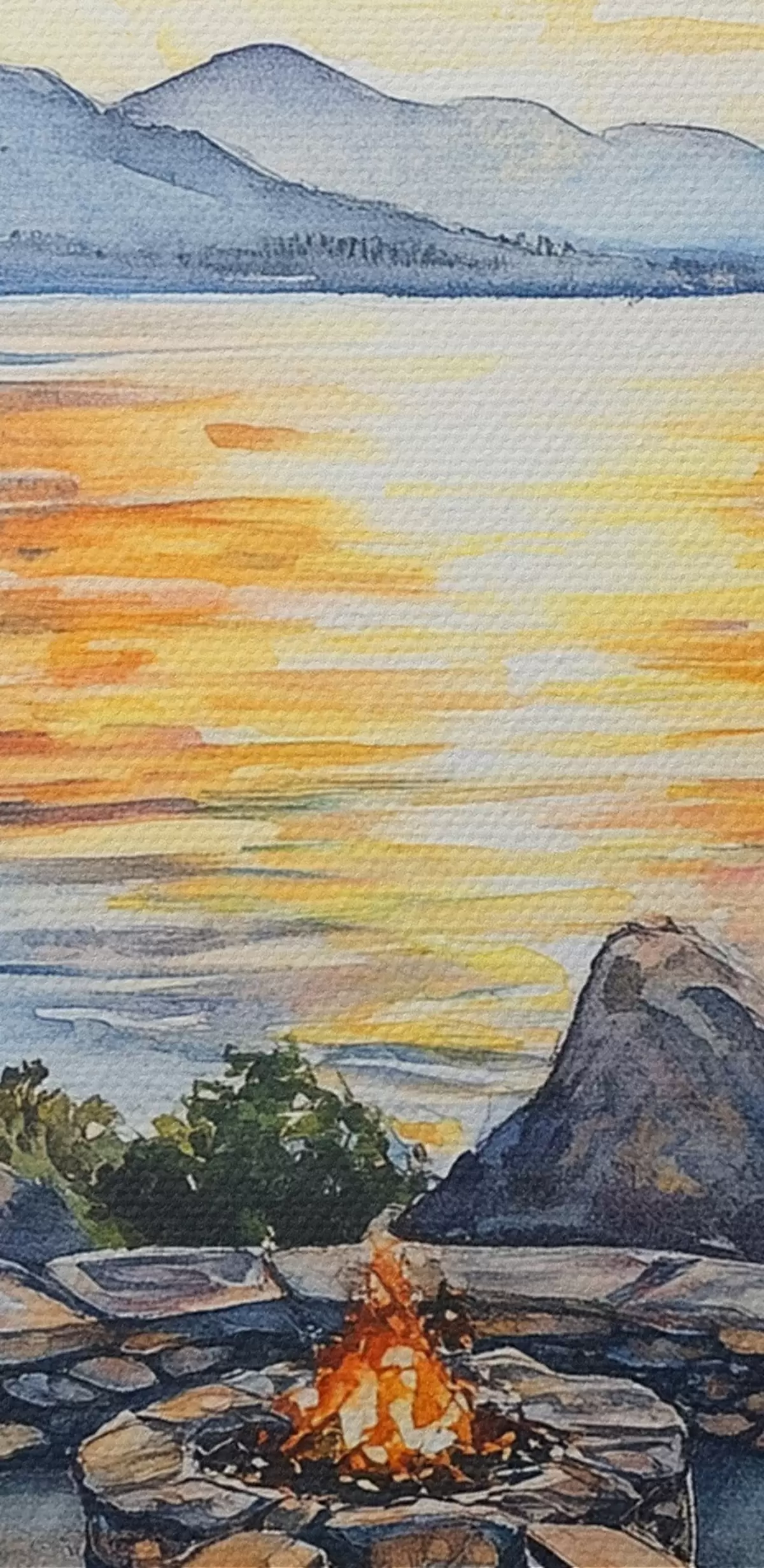 Picturi rotunde Lac cu munți pe apus de soare, călătorie, șemineu confortabil, acuarelă Nr r44018