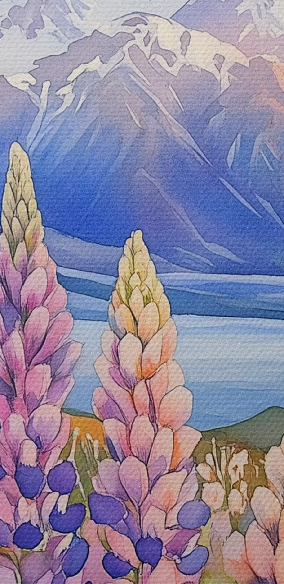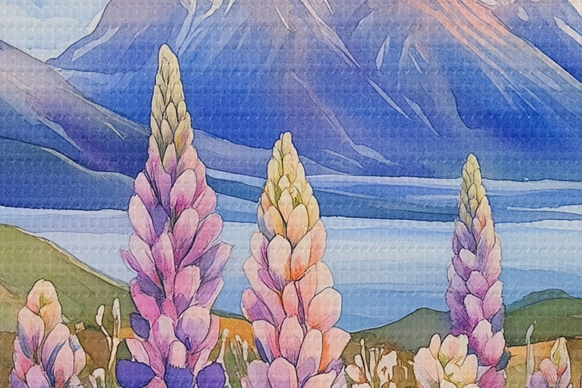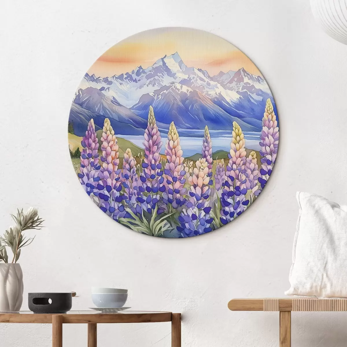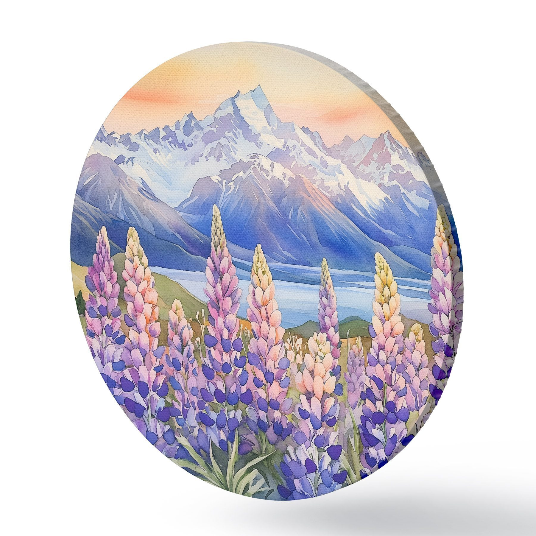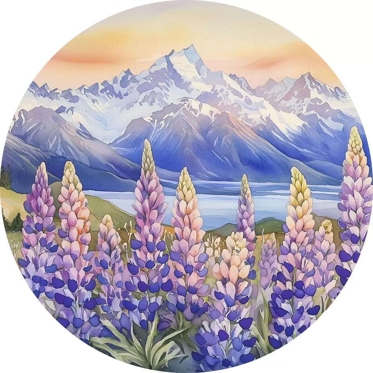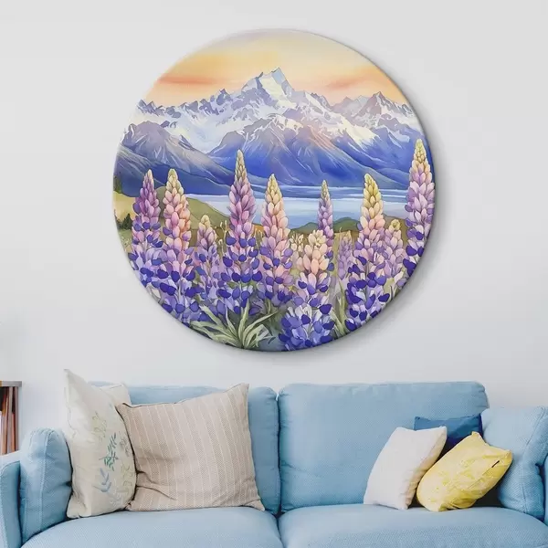 Picturi rotunde Lupin flori, pajiște, munți, stil acuarelă, apus de soare cer r44146