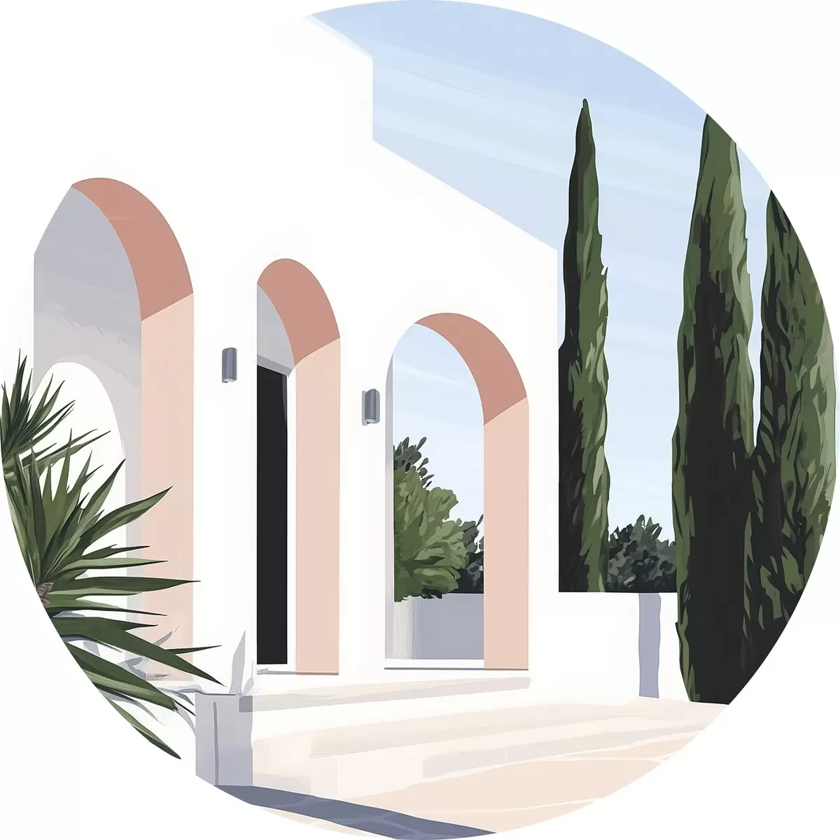 Picturi rotunde Vilă albă cu arcade și grădină tropicală, mediteraneană, stil plat Nr r44153