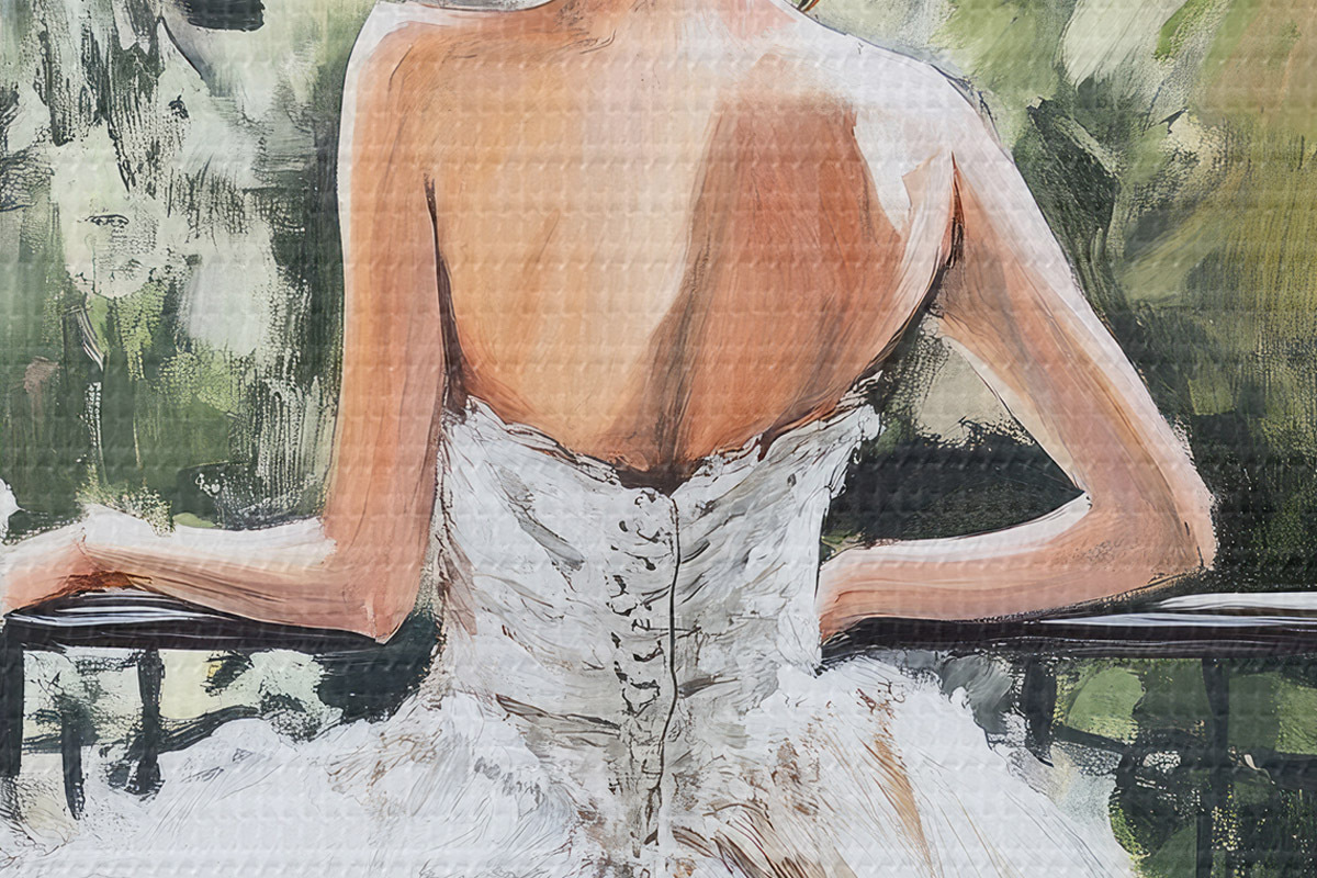 Țesătura fină a firelor de pe această pânză seamănă cu suprafața pânzelor artiștilor profesioniști.